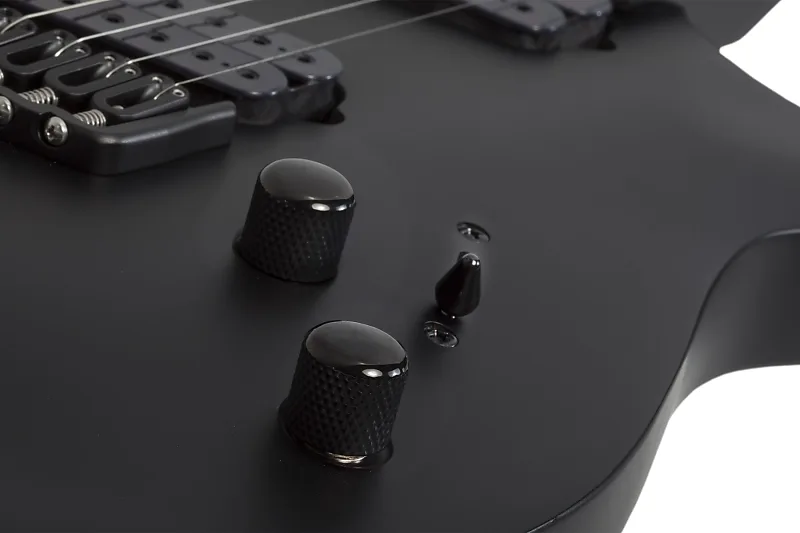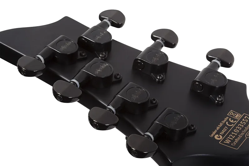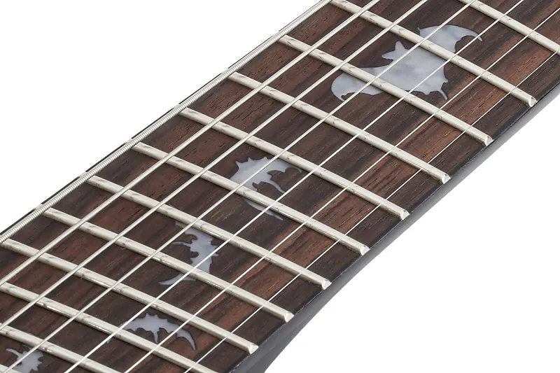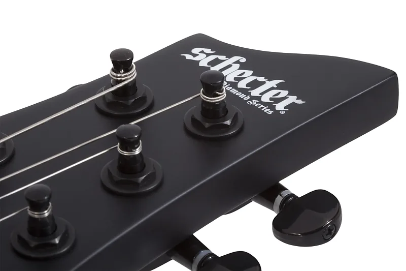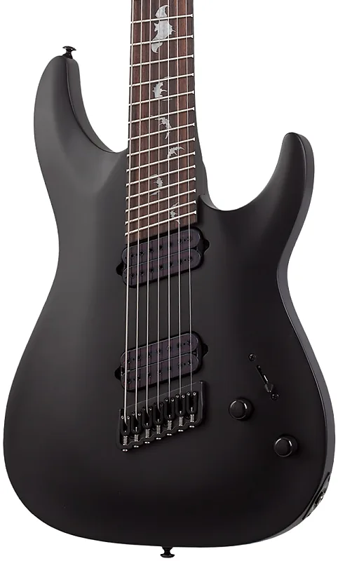 Ее корпус из красного дерева сочетается с фиксированным мостом Hipshot для 7-струнной мультискейл-гитары, обеспечивая надежную стабильность настройки и отличное сустейн. Звукосниматели Schecter Diamond Heretic дают агрессивные тона с высоким выходом, а функция push-pull coil split расширяет тональные возможности. Знаковые накладки Grey Pearloid Bat, полностью черная фурнитура и матово-черная отделка завершают зловещий вид этой гитары мечты для шреддера.
