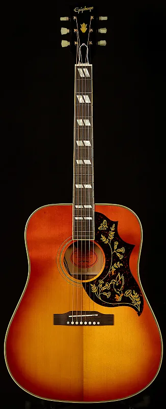 Гибсон Хаммингберд был впервые представлен в 1960 году и стал первой моделью акустической гитары с квадратным плечом в каталоге Gibson. Он появился на заре новой музыкальной эры и с тех пор был замечен в руках многих исполнителей, включая Кит Ричардса и Брайана Джонса из The Rolling Stones, Эрика Черча, Джея Маскиса, Джо Бонамасса, Джиллиан Уэлч, Тома Йорка и Джонни Гринвуда из Radiohead, Стива Уоринера, Дэна Ауэрбаха и многих других. Многое в привлекательности Хаммингберда заключается в его универсальности. Неважно, как вы играете на этой гитаре с плоской декой - мягко перебираете струны пальцами, энергично аккордируете или исполняете соло по одной ноте - она выдает прекрасное звучание, что делает ее идеальным выбором независимо от музыкального жанра. Теперь компания Epiphone, в сотрудничестве с Gibson Custom, с гордостью представляет модель 1960 Hummingbird Reissue, воссозданную по мотивам первых иконных гитар Хаммингберд. Эта великолепная акустическая гитара имеет термически состаренную верхнюю деки из массива ели, усиленную традиционная волнообразная X-образная распорка, выполненная из радиально распиленной массивной ели. Задняя часть и боковины 1960 Hummingbird Reissue выполнены из массивного махагони. Это обеспечивает теплый, богатый тембр в целом, который прекрасно подходит для множества музыкальных стилей. Односоставная шея из термически старенного махагони длиной 24,75" имеет округлый профиль и оснащена окантованной накладкой из палисандра с 20 стандартными ладами и инкрустацией в виде разделенных параллелограммов из перламутра.