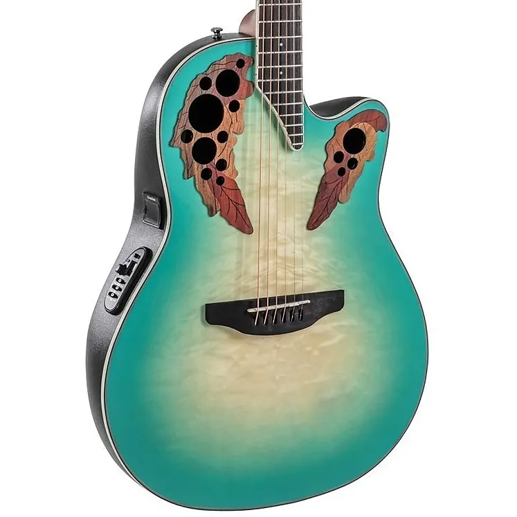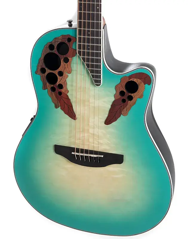 Ovation CE44X-9B Celebrity Elite Plus Mid Depth в цвете MintburstСерия Ovation Celebrity Collection Elite Plus - это готовая к выступлениям гитара, сочетающая впечатляющий внешний вид и чистое живое звучание. Уникальный многозвуковой дизайн Ovation обеспечивает ясные высокие частоты и сфокусированный, сбалансированный бас. Верхняя дека из клена Quilted Maple выполнена с лазерной резкой погон, которые выделяют ее среди остальных, и обеспечивают выдающуюся чистоту звучания каждой ноты. Она имеет уникальное глянцевое покрытие Mintburst.