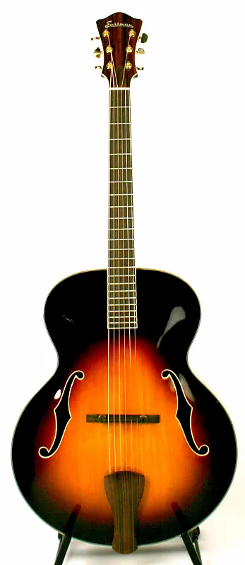 Эта редкая полностью акустическая арктоп-гитара Eastman доставляет огромное удовольствие при игре! Она обладает гораздо большей акустической громкостью, чем ее электрические аналоги, а звук насыщенный и полный. Она очень напоминает классический дизайн Llyod Loar L5 и Collins AT16, но при этом стоит лишь часть цены. цена. Она отлично подходит для свинг-ритма на гитаре, прекрасно подходит для соло игры с использованием пальцев, а также отлично справляется с цыганским джазом.