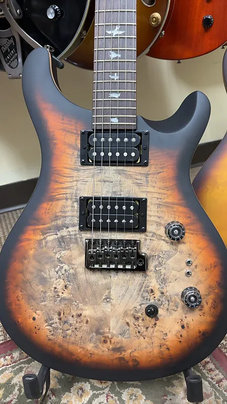 SE Custom 24-08, верх из вырезанного капа тополя с задней частью из красного дерева, длина мензуры 25", гриф из клена с 24 ладами, накладка на гриф из палисандра, инкрустация в виде птиц, тремоло с запатентованным механизмом PRS, звукосниматели TCI «S» для высоких и басов, регуляторы громкости и тонов с функцией push/pull, 3-позиционный переключатель звукоснимателей, 2 мини-переключателя, чехол