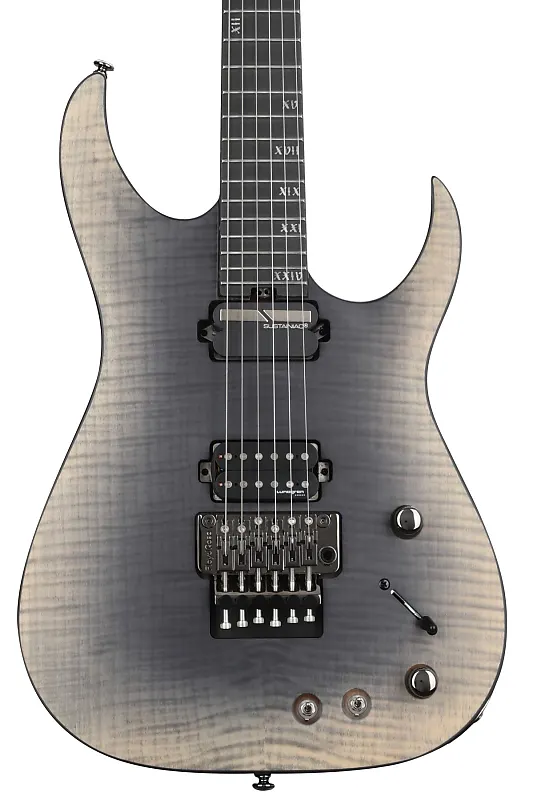 Электрогитара с цельным корпусом из древесины свап-эша, верхняя дека из клена, гриф из клена и пурпурного дерева, накладка на гриф из эбена, один хамбакер и система Sustaniac - FalloutBurst.