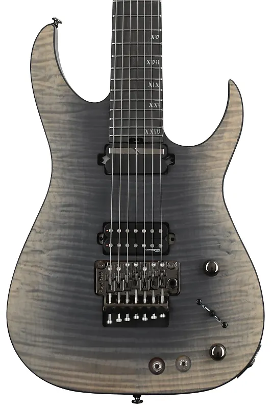7-струнная электрогитара с цельным корпусом из ясеня, верхняя дека из клена, гриф из клена и пурпурного дерева, накладка на гриф из эбена, один хамбакер и система Sustaniac - Fallout Burst.