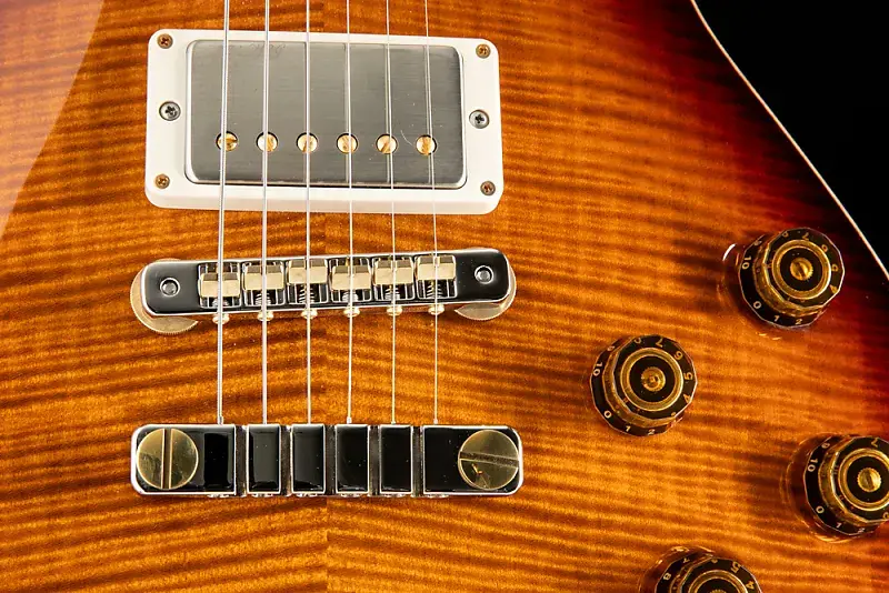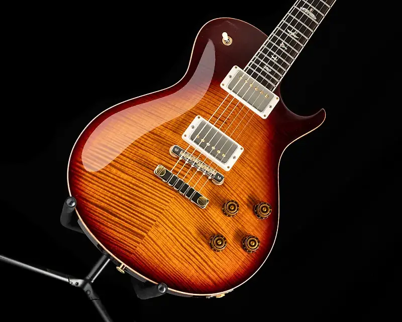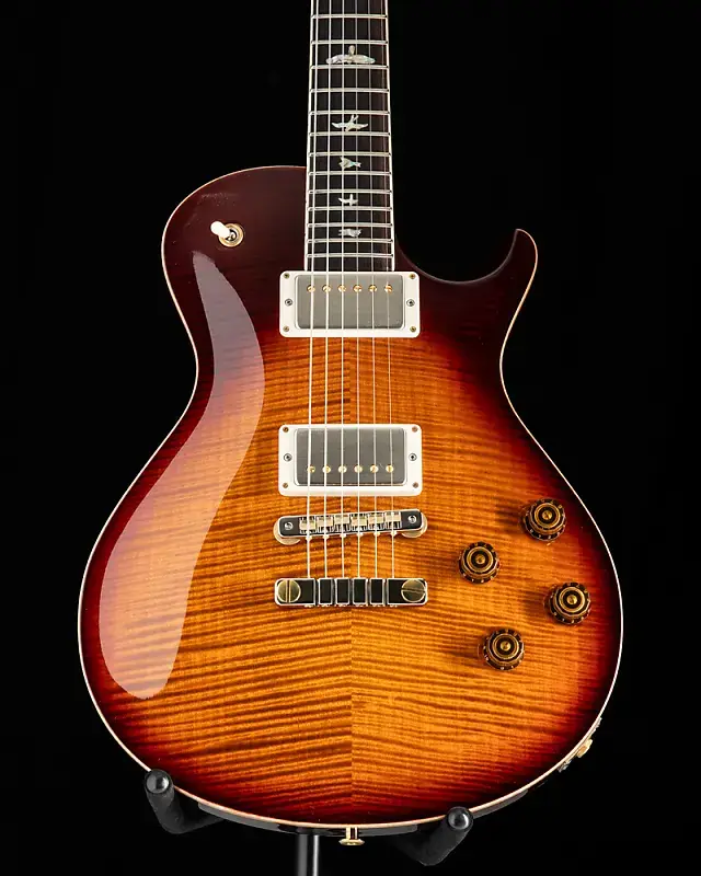 PRS McCarty Singlecut 594 Dark Cherry Burst Серийный номер: 0371251 Вес: 8,0 фунтов Отделка: Dark Cherry Burst Древесина верха: Резной фигурный клен, 10 Top Древесина задней части: Махагон Количество ладов: 22 Длина мензуры: 24,594" Древесина грифа: Махагон Форма грифа: Pattern Vintage Глубина грифа у порожка: 28,5/32” Ширина накладки у корпуса: 2 1/4” Ширина накладки у порожка: 1 11/16” Древесина накладки: Палисандр с имитацией костяной окантовки Инкрустация на накладке: Птицы Мост: PRS двухсекционный, литой из цинка Колки: Винтажного стиля Тип фурнитуры: Гибридная Звукосниматель для высоких частот: 58/15 LT Звукосниматель для низких частот: 58/15 LT Органы управления: 2 Регуляторы громкости, 2 регулятора тембра Push/Pull, 3-позиционный переключатель Струны: 10