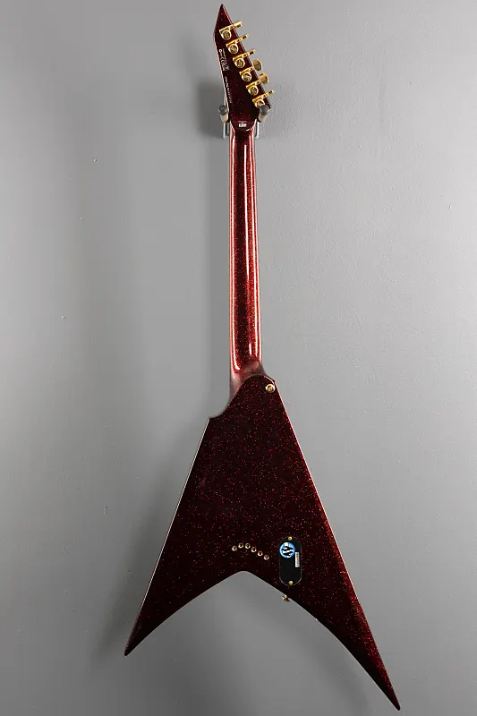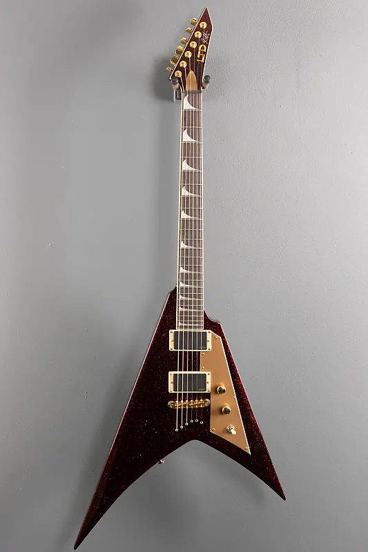 «Будучи ведущим гитаристом группы Metallica, самой крупной хэви-метал группы всех времен, Кирк Хэмметт вдохновлял поколения музыкантов более 40 лет. Соло Кирка - важная часть доминирующего звучания Metallica, и на протяжении десятилетий он полагается на ESP, создавая гитары, которые полностью удовлетворяют его потребности. LTD KH-V - новейшее добавление в серию Kirk Hammett Signature. Она доступна в трех различных версиях: Black Sparkle с черной фурнитурой и черным накладочным щитом; Red Sparkle с золотой фурнитурой и золотым накладочным щитом; и Metallic Gold с золотой фурнитурой и кремовым накладочным щитом. Модель KH-V имеет конструкцию neck-thru-body, с особо тонкой U-образной трехсекционной грифовой накладкой из клена и корпусом из корианы, длина мензуры 25,5 дюймов. Гриф с накладкой из маккассарского эбена оснащен вставками в виде волны из перлоида и 24 экстразамба-ладовыми порожками. Звук KH-V обеспечивается комплектом фирменных звукоснимателей Кирка EMG Bone Breaker, с керамическим синглом BB-B у бриджа и алнико 5 BB-N на грифе, обеспечивающих чистое, мощное соло или» гладкие, округлые ритмичные тона одним переключением. Регулировки KH-V включают громкость, тембр и трехпозиционный переключатель звукоснимателей. Другие профессиональные функции включают мост TonePros со струнами через корпус и замковые колки LTD. В комплекте идет эксклюзивный жесткий чехол ESP.