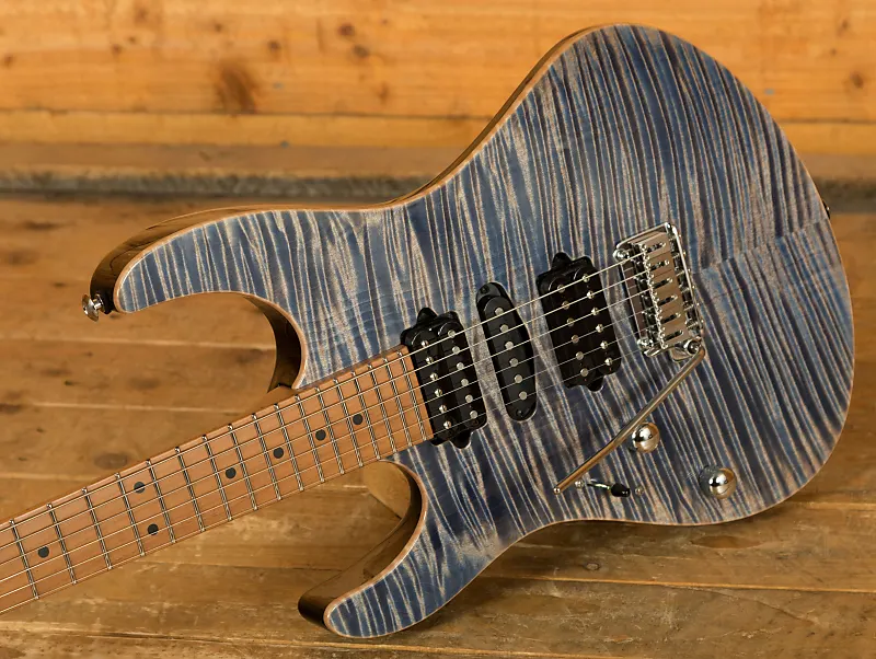 С корпусом из липы и великолепной верхней декой из клена Flame Maple, этот инструмент обладает превосходным звучанием, малым весом и прекрасно сбалансирован для игры. Suhr выполнили его в цвете Trans Blue и использовали контуры для руки, кисти и живота, чтобы создать максимально комфортное ощущение при игре.
