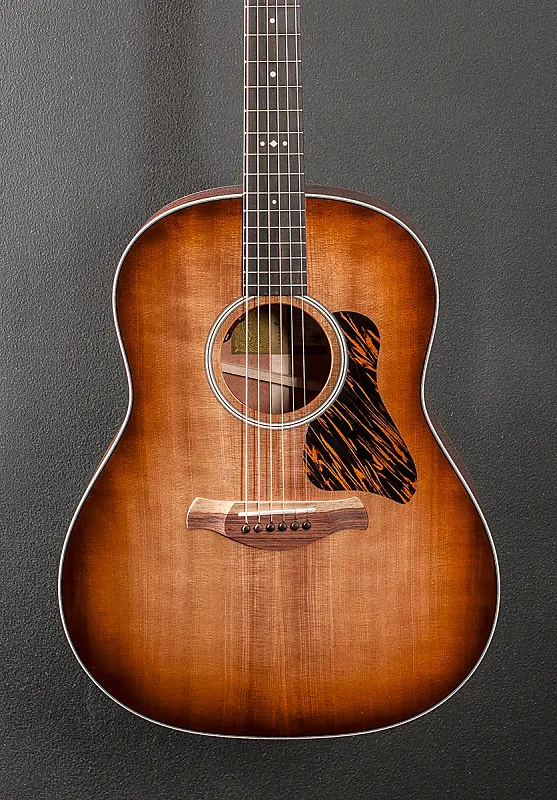 Верх Golden Brown Shaded Edgeburst, глянцевая отделка верха и корпуса, форма корпуса Grand Pacific Round Shoulder Dreadnought, верх из тонированной ели Sitka, одноцветная кремовая розетка, фанерованная система V-Class с Tonal Route, спинка и боковины из тропического красного дерева, кремовая окантовка, африканское эбеновое дерево Crelicam гриф с инкрустациями Cream Crest на грифе из нео-тропического махагони, длина мензуры 25,5", ширина верхнего порожка 44,45 мм, литые/запаянные колки, с системой звукоснимателей L.R. Baggs Element VTC и жестким чехлом
