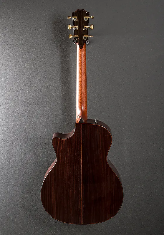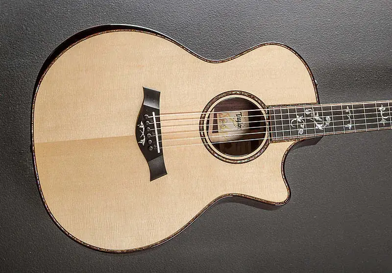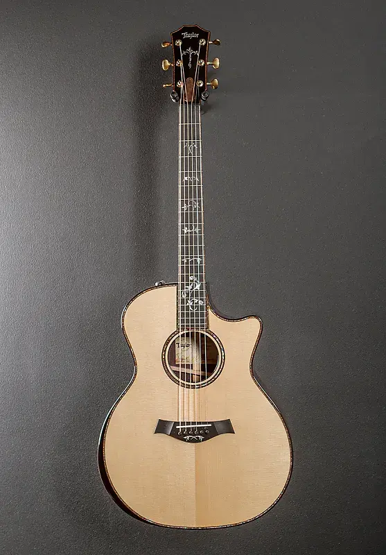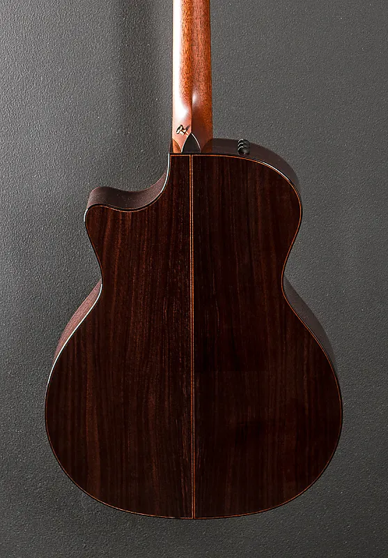 Натуральная глянцевая отделка верха и корпуса, корпус Grand Auditorium с венецианским вырезом и подлокотником из западноафриканского эбенового дерева Crelicam, дека из ели Энгельмана, одно кольцо Пауа