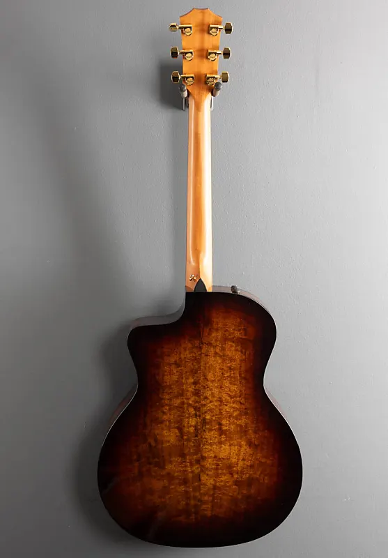 Shaded Edge Burst, форма корпуса Grand Auditorium с венецианским вырезом, верхняя дека из гавайского коа, одинарная розетка Pearloid, X-образные струны, ламинированная задняя часть и боковины из гавайского коа, черная окантовка, гриф из африканского черного дерева Crelicam с маленьким ромбовидным инкрустацией. Гриф из нео-тропического махагони, длина мензуры 25,5 дюймов, ширина верхнего порожка 1 11/16 дюйма, с системой звукоснимателей Expression 2 и жестким футляром