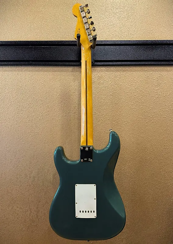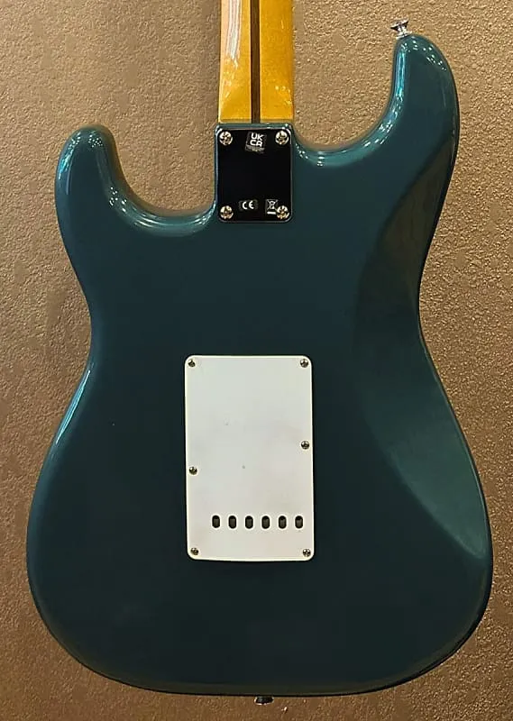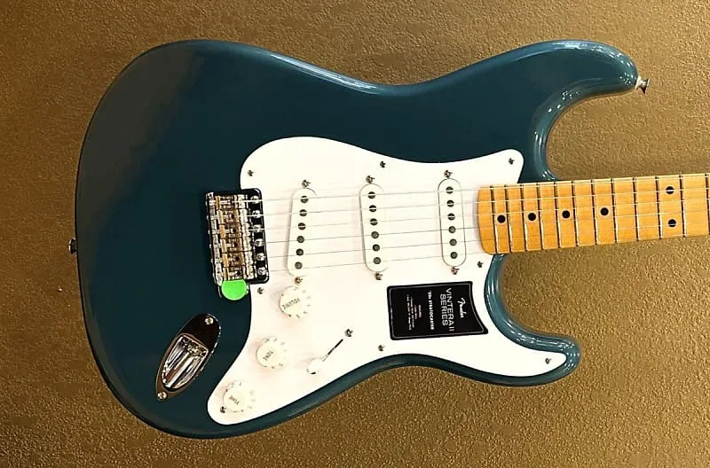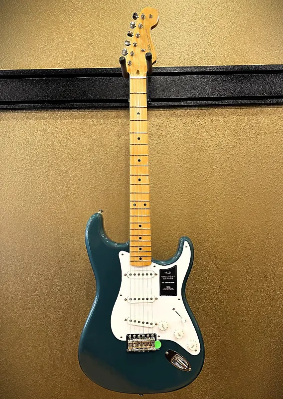 Цвет Ocean Turquoise, Сделано в Мексике, Корпус из ольхи, Глянцевая полиэфирная отделка корпуса, Гриф из клена формы Soft V середины 50-х с радиусом 7,25” и накладкой из клена с высокими винтажными ладьями, Длина мензуры 25,5", Ширина верхнего порожка 1,650", Сингл-пикапы Strat в стиле 50-х, 5-позиционный переключатель с общим регулятором громкости, регулятором тембра 1 (гриф/середина) и регулятором тембра 2 (бридж), Вибрато в винтажном стиле с изогнутыми стальными седлами, Колки в винтажном стиле, Вес 7,8 фунтов, В комплекте чехол для гитары