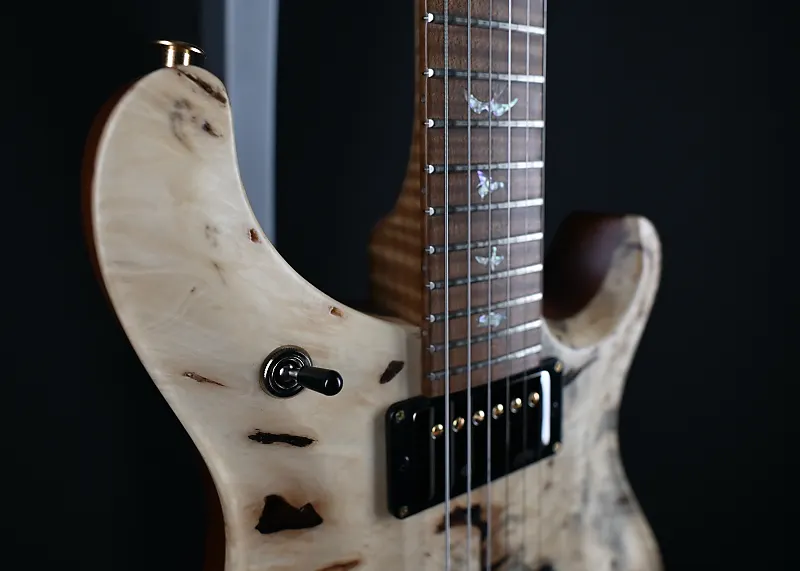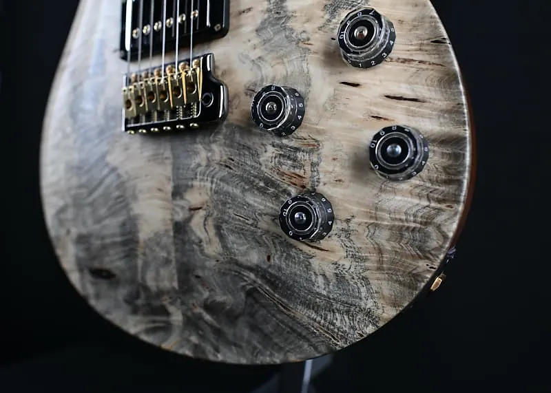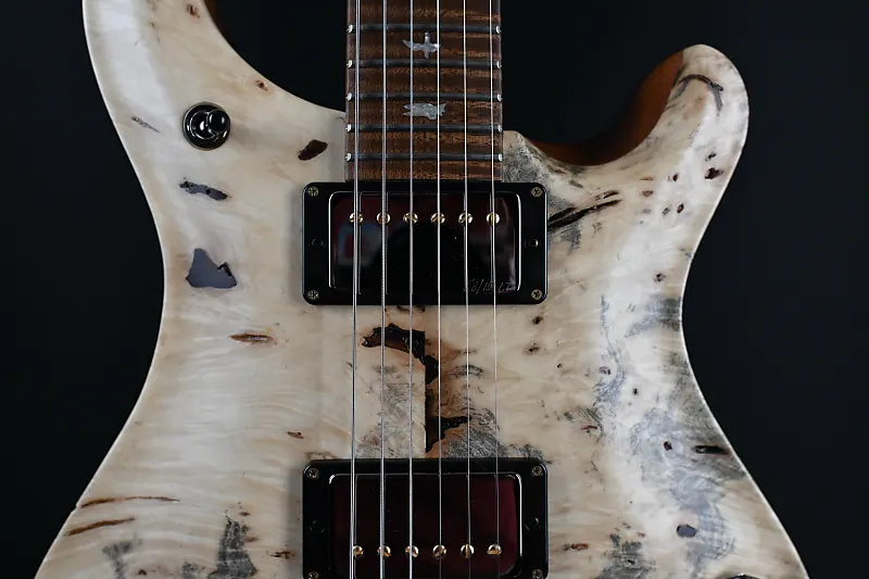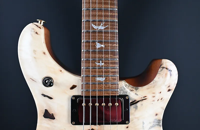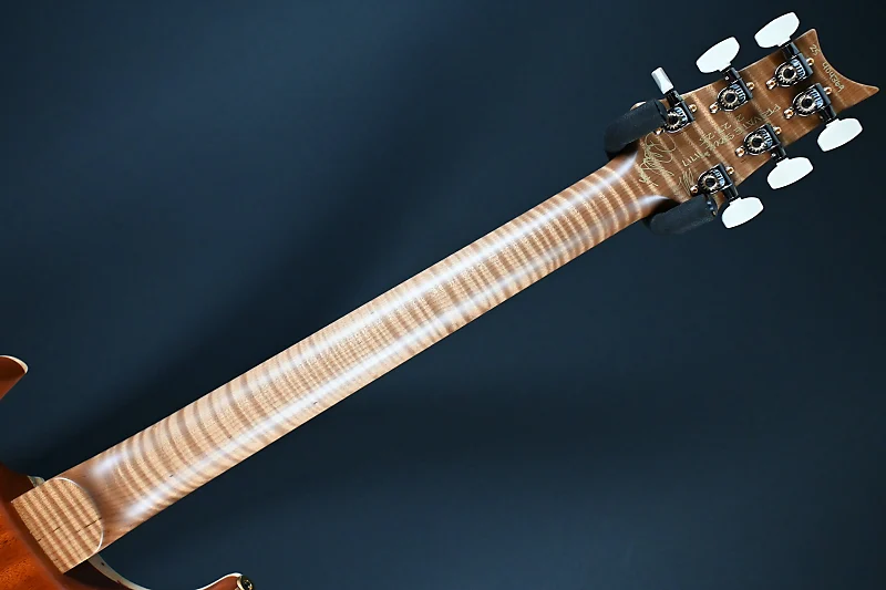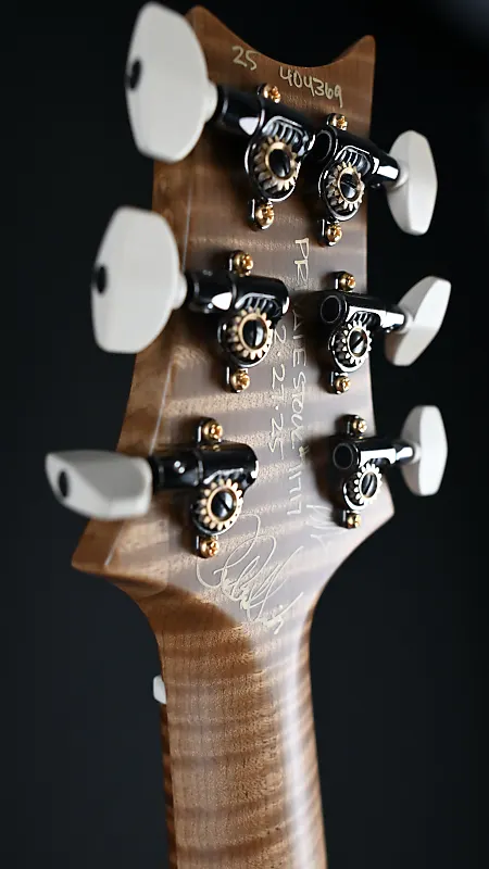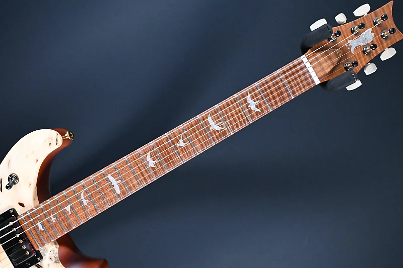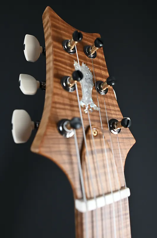 - Фурнитура: тремоло мост PRS Gen III черно-золотой, колки PRS Phase III с винтовой фиксацией и крыльями, задние накладки из африканского махагони, кость для гайки грифа, а также стальная струна с обожженного кудрявого клена