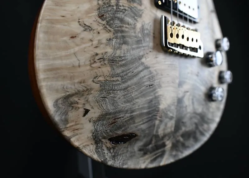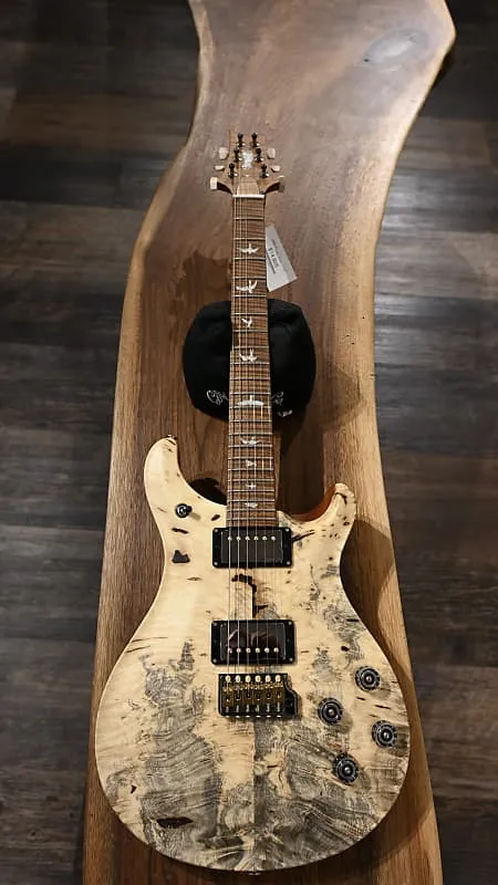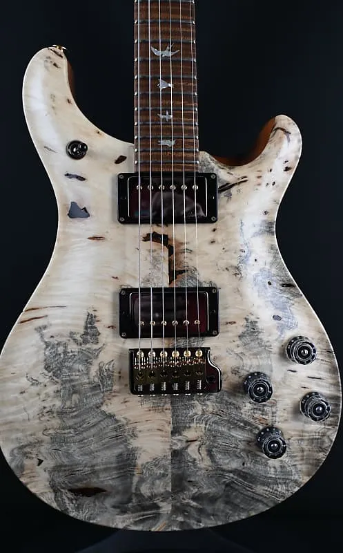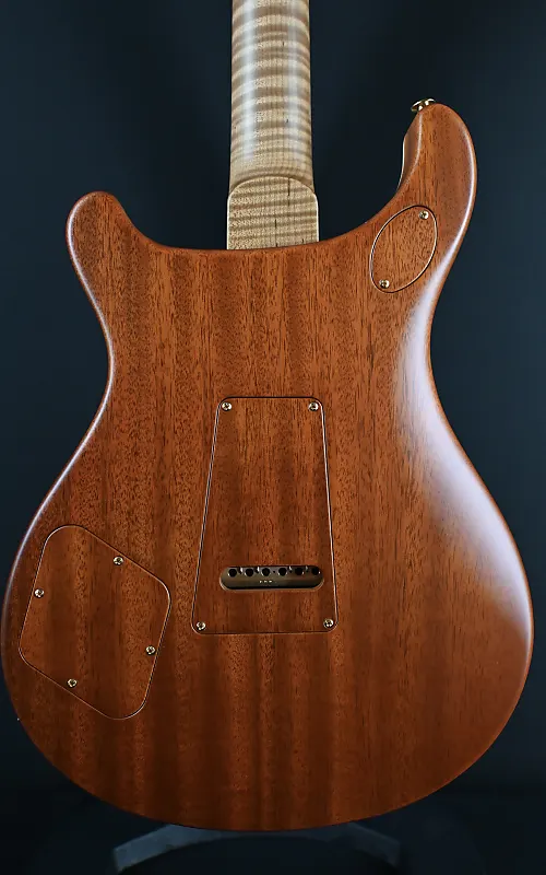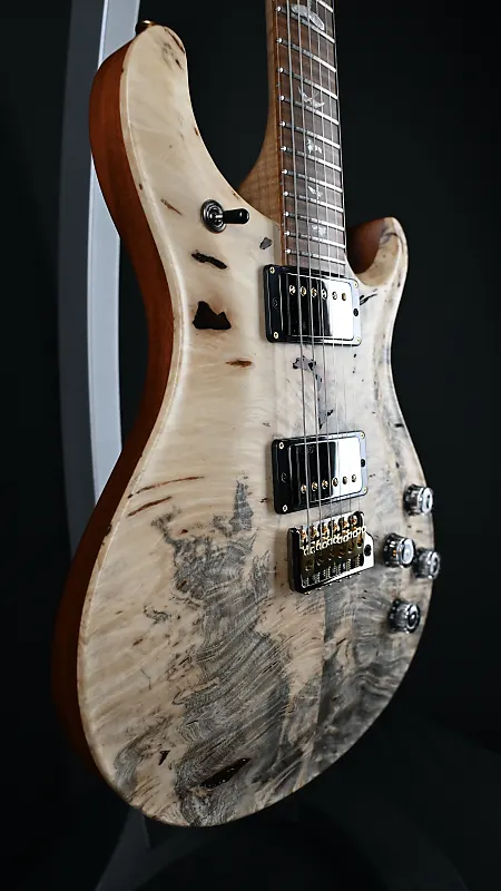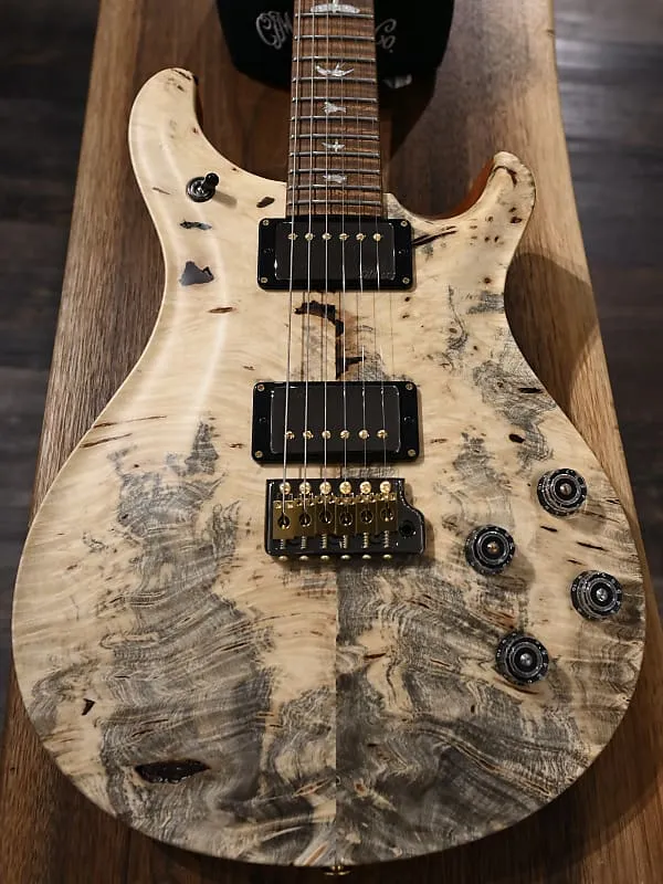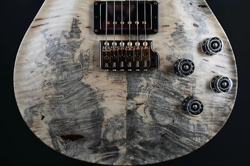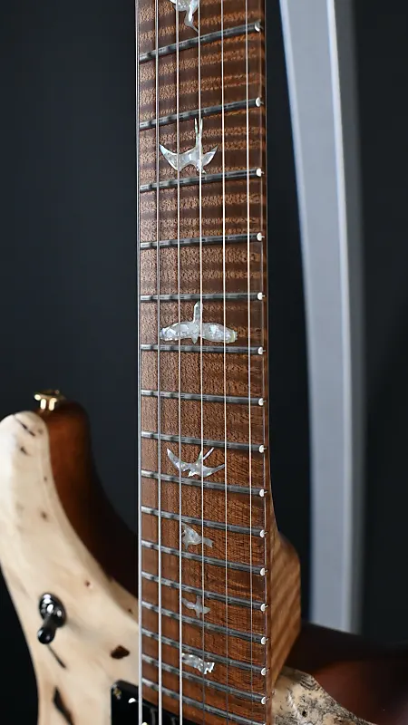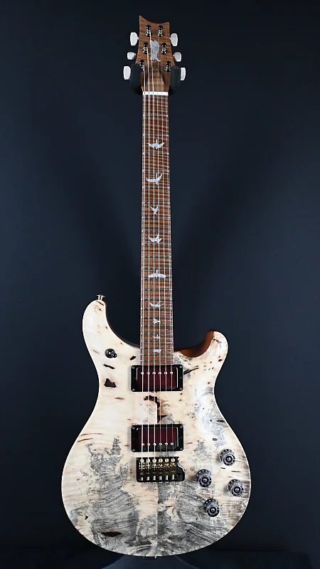 - Фурнитура: тремоло мост PRS Gen III черно-золотой, колки PRS Phase III с винтовой фиксацией и крыльями, задние накладки из африканского махагони, кость для гайки грифа, а также стальная струна с обожженного кудрявого клена