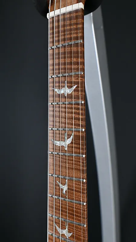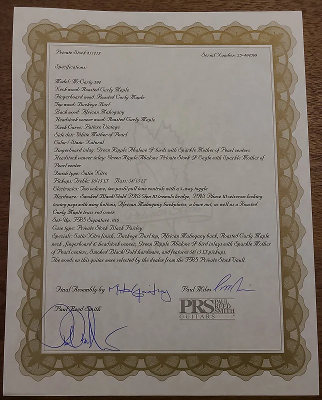 coverНастройка: PRS Signature .010Тип корпуса: Private Stock Black PaisleyОсобенности: Сатиновая нитро-отделка, верх из ореха Бакей, спинка из африканского красного дерева, шея из жареного кудрявого клена, накладка грифа и шейка с фанерой, инкрустации птиц «J» из зеленого рябого перламутра с центрами из перламутра с блестками, элементы черного/золотого цвета, звукосниматели 58/15 LT.Древесина для этой гитары была выбрана дилером из сейфа PRS Private Stock.
