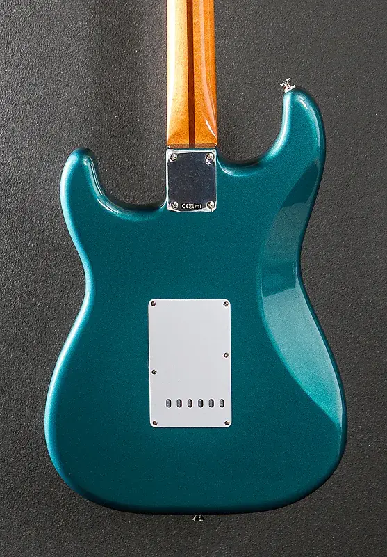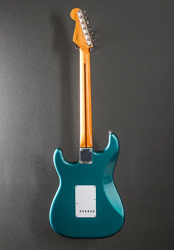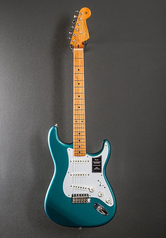 Цвет Ocean Turquoise, изготовлено в Мексике, глянцевая полиэфирная отделка корпуса, корпус из ольхи, гриф из клена средней 50-х мягкой V-образной формы с накладкой из клена радиусом 7,25” и прорезями винтажной высоты, длина мензуры 25,5", ширина комплекта 1,650", звукосниматели Strat однотипные винтажного стиля 50-х, 5-позиционный переключатель с регуляторами master volume, tone 1 (гриф/средний звукосниматель) и tone 2 (бридж), винтажный синхронизированный тремоло с изогнутыми стальными седлами, тюнеры винтажного стиля, вес 7,4 фунта, в комплекте чехол