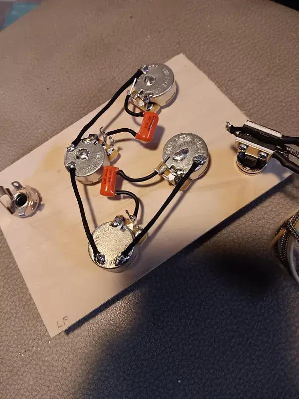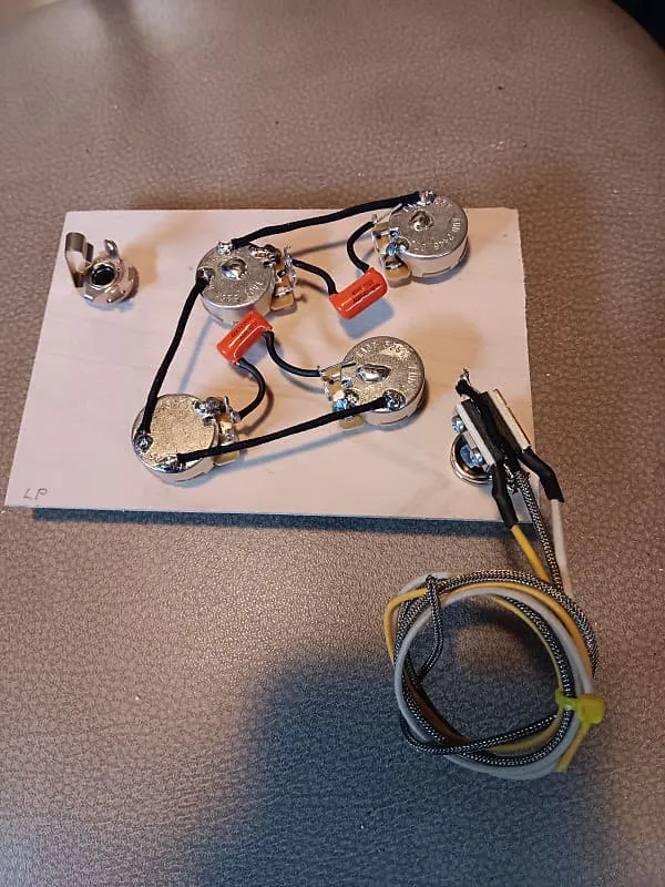 Это полноразмерная проводка для Les Paul, изготовленная из компонентов высочайшего качества. В ее сборке используются короткий корпус переключателя Switchcraft, 3-позиционный тумблер, потенциометры CTS 500k, разъем Switchcraft, конденсаторы CDE 0,022 мкФ, 200 В и оплетенные провода в винтажной тканевой изоляции.