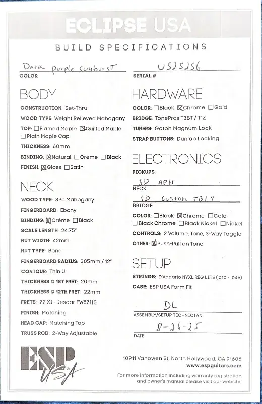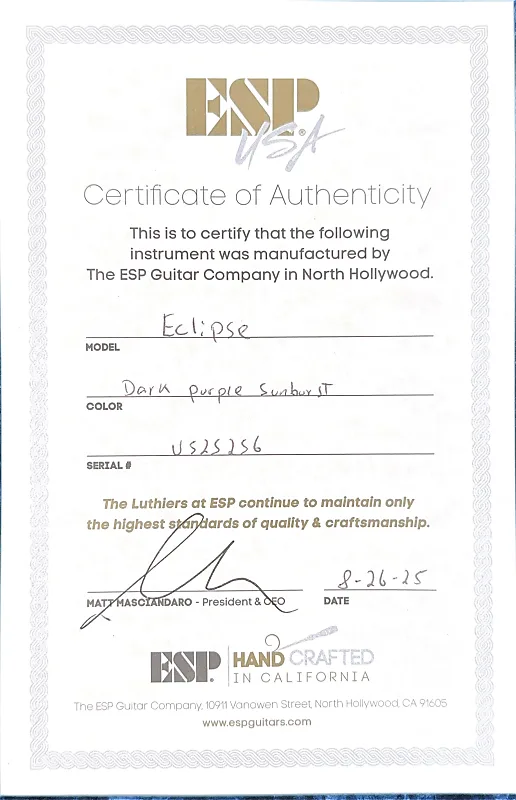 В 2014 году магазин ESP USA открылся в Норт-Голливуде, Калифорния, чтобы изготавливать инструменты, которые продолжают высоко оцененную традицию ESP в мастерстве создания гитар. Если вы ищете гитару, которая предлагает оптимальное сочетание качества сборки и удобства игры на инструменте любой ценовой категории - и при этом на 100% произведена в США - ESP USA станет правильным выбором. Эти выдающиеся гитары доступны через ограниченный список авторизованных дилеров и дистрибьюторов ESP Guitars по всему миру.