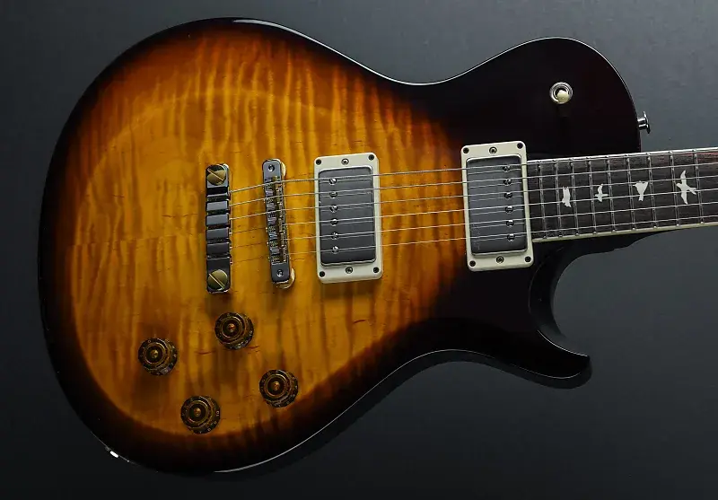 Black Amber, асимметричная кленовая верхняя дека с фаской на корпусе из махагони. Винтажная модель Pattern с вырезанной грифом из махагони, радиус 10″ грифовой накладки из розового дерева с инкрустацией в виде птиц и имитацией костяной окантовкой, длина мензуры 24,594″, ширина грифа у колка 1 11/16″, звукосниматели PRS 58/15 LT для моста и грифа, 3-позиционный переключатель с регулировкой громкости и с двумя кнопками «push/pull» для переключения катушек на каждом звукоснимателе, двухсекционный мост PRS и винтажные колки без фиксации с кнопками «Wing», вес 8,1 фунта, поставляется с чехлом для переноски.