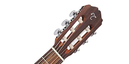 Другие замечательные особенности включают шиповое соединение грифа, красивую мозаичную розетку, верхние порожки и седла из синтетической кости, декоративную накладку на головку грифа из лавра, хромированные колки с белыми перламутровыми кнопками и элегантную глянцевую отделку.