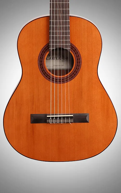 Cordoba Requinto - это акустическая гитара с нейлоновыми струнами половинного размера, с уменьшенным корпусом, грифом и общими габаритами по сравнению с полноразмерной гитарой. Длина мензуры Requinto составляет 580 мм (22,8 дюйма), а ширина грифа у струнодержателя - 47 мм (1,85 дюйма). Верхняя дека выполнена из цельного канадского кедра, а задняя часть и деки боковин - из африканского красного дерева. Верхняя дека укреплена системой распорок в стиле Торрес с пятью веерообразными брусками для теплого и резонирующего звука. Гриф изготовлен из легкого красного дерева, а накладка - из палисандра.