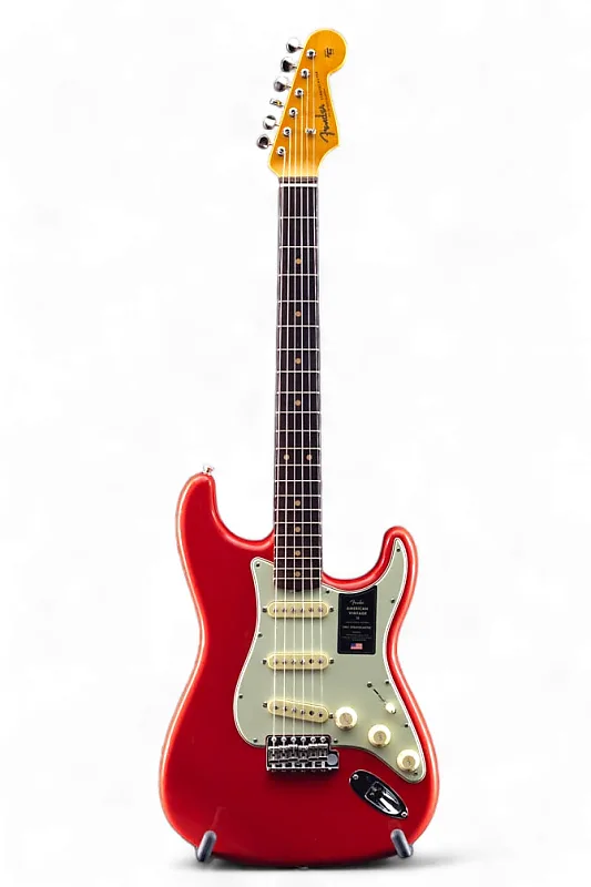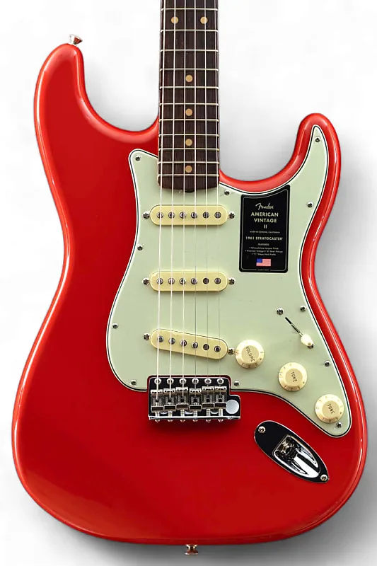 Оснащенный корпусом из высококачественного ольхового дерева, тремя звукоснимателями Pure Vintage 1961 Stratocaster и средним грифом «C»-образной формы из клена с накладкой для грифа из розового дерева радиусом 7,25 дюйма, American Винтажный Stratocaster II 1961 года воспроизводит характерный тон и ощущение оригинальной модели. Другие особенности включают винтажно-точную синхронизированную тремоло с блоком из холоднокатаной стали и изогнутыми стальными седлами, одноуровневые колки "Fender Deluxe" и 3-слойный накладной пикгард.