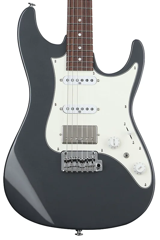 Электрогитара с цельным корпусом из ольхи, гриф из клена, грифовая накладка из палисандра, одна хамбакер-пикап и два сингловых пикапа - серо-металлическая.