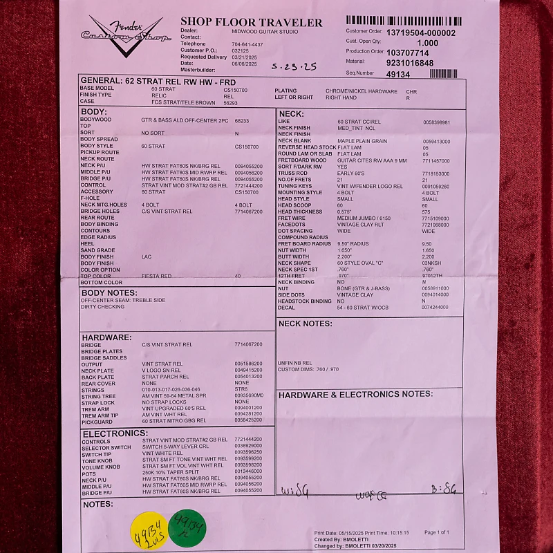 Представляем великолепную электрогитару Fender Custom Shop 1962 Stratocaster Relic в цвете Fiesta Red. Эта Stratocaster имеет корпус из двух частей ольхи, набор ручной намотки звукоснимателей Fat 60s, аккуратное старение, имитирующее многолетнюю стандартную игру, гриф овальной формы "C" в стиле 60-х с набором ладов среднего размера на красивой накладке из палисандра. Это универсальная Stratocaster, способная справляться с любой техникой игры и музыкальными жанрами.