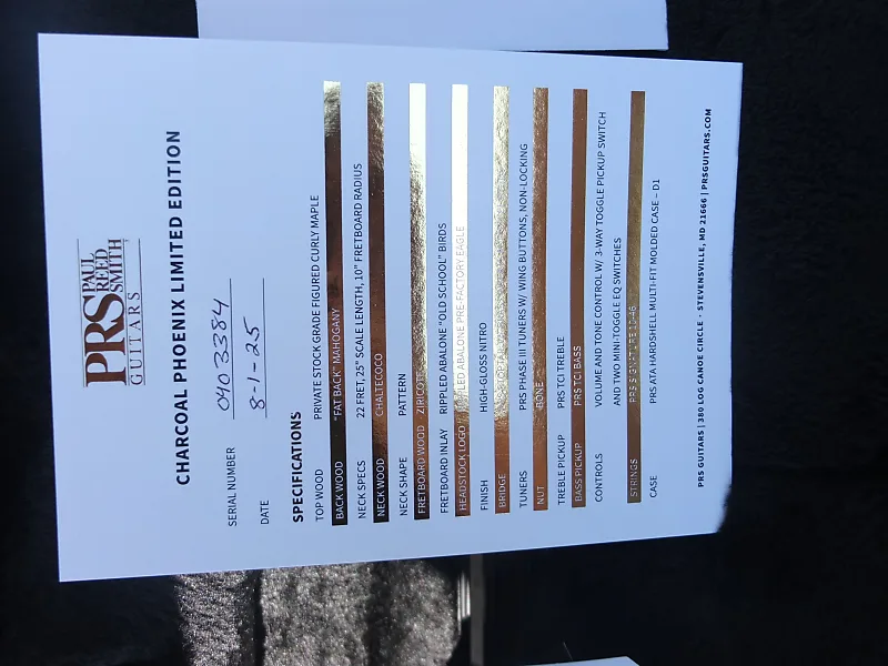 Вот совершенно новый Paul Reed Smith Limited Edition Charcoal Phoenix! Эта гитара просто поражает воображение! Этот красавец оснащен безумно красивой крышкой из кудрявого клена класса Private Stock, соединенной с корпусом из отборного магонии «Fat Back». Гриф изготовлен из Chaltecoco, древесины из Центральной Америки, которая очень твердая и резонирующая, позволяя ноте звучать с большим сустейном. Накладка на гриф и накладка на головку грифа выполнены из великолепного слэба гирицоте. Гитара также оснащена оригинальными инкрустациями «Old School» Birds in Flight, выполненными из Ripple Abalone. Звукосниматели - это специально намотанная версия деталей TCI, которую Пол настроил в соответствии с личными потребностями и вкусами. Панель управления включает главный регулятор тембра, главный регулятор громкости, трехпозиционный переключатель звукоснимателей и два мини-тоггла, которые НЕ являются катушечными переключателями на этой гитаре, а вместо этого активируют специально разработанные EQ-схемы для каждого звукоснимателя, давая доступ к восьми различным тонам с подавлением шума. Легкая гитара поставляется с совершенно новым PRS жестким кейсом. Футляр для гильз, чтобы защитить ваши вложения. Только для США, пожалуйста, отправка UPS с страховкой.