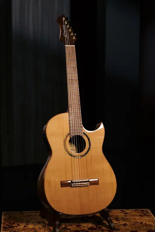 Ortega FLAMETAL-TWO - это классическая гитара из серии подписных моделей Бена Вудса. Передняя дека гитары изготовлена из массива красного кедра, задняя дека и короба - из ореха. Гриф из пау ферро оснащен 19 ладами. Гриф гитары сделан из махагона, ширина у нулевого лада - 48 мм, мензура - 650 мм. Гитара имеет глянцевую отделку и оснащена системой звукоснимателя Ortega/Fishman Clasica Blend с встроенным тюнером. Гитара продается вместе с оригинальным фирменным чехлом Ben Woods и наклейкой фламенко на передней деке.