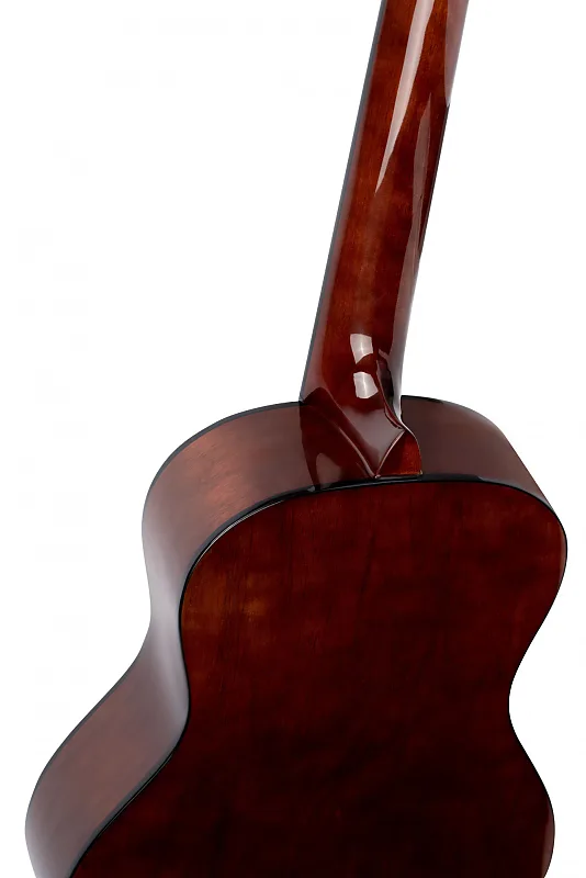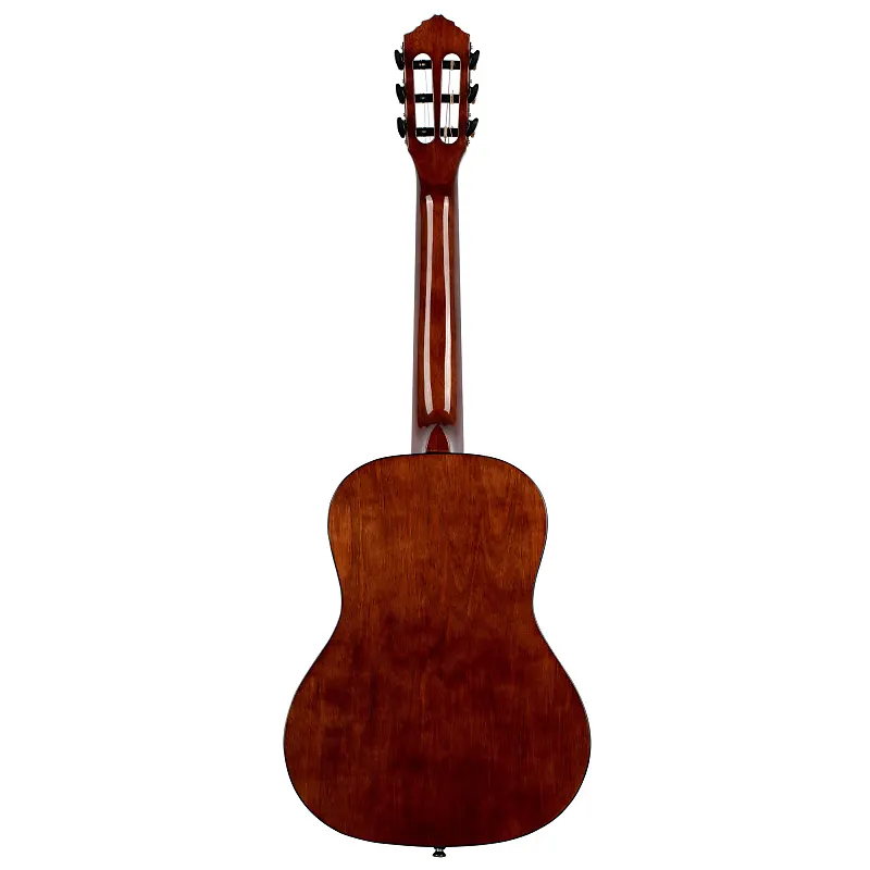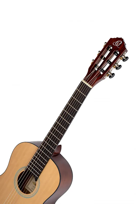 Ortega R121-1/2 6-струнная классическая гитара из серии Student Series. Гитара изготовлена в размере 1/2 с верхней дека из ели. Задняя дека и обечайки выполнены из катальпы, гриф из махагона, а гриф с ореховой накладкой оснащен 18 ладами. Ширина у верхнего порожка составляет 43,5 мм, мензура гитары - 560 мм. Гитара имеет натуральную матовую отделку.