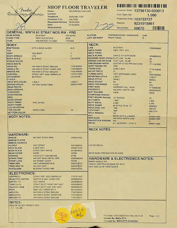К 1961 году Stratocaster быстро становился культурной сенсацией после того, как такие музыканты, как Хэнк Марвин, взорвали радиовещание. Шестидесятые также были захватывающим временем для дизайна Stratocaster, когда Лео и его команда впервые оснастили их грифами из розового дерева. Розовое дерево создавало сладкое звучание, которое полюбили все - от Хендрикса до SRV! Наши Stratocaster Wildwood 10 1961 года отдают дань великому буму Strat в шестидесятые, и мы считаем, что они воплощают сладкие звуки той эры во всей полноте. У нас есть широкий выбор цветов, состаренных отделок и профилей грифа, так что мы приглашаем вас просматривать и найти Strat, который затронет струны вашего сердца. Как только вы это сделаете, мы уверены, что вы попадете под очарование Stratocaster Wildwood 1961.