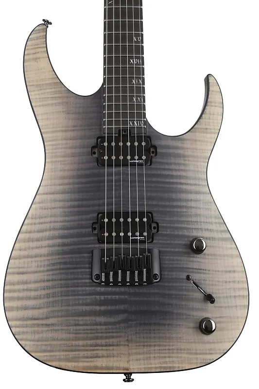 Электрогитара с цельным корпусом из древесины болотного ясеня, верхняя дека из клена, гриф из клена и пурпурного дерева, грифовая накладка из эбена и два хамбакерных звукоснимателя - расцветка Fallout Burst.