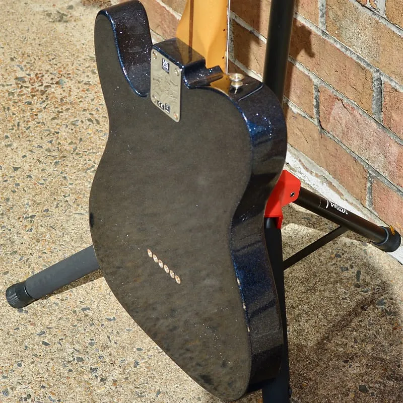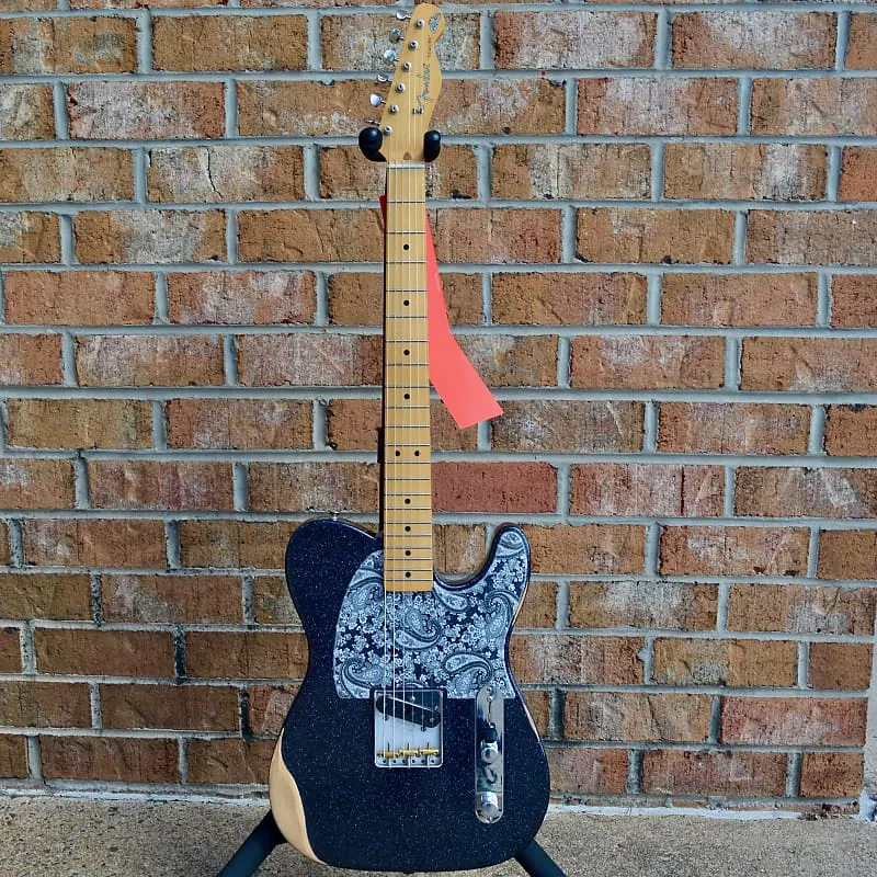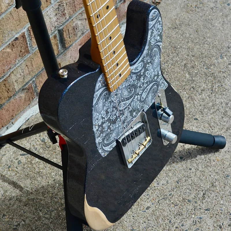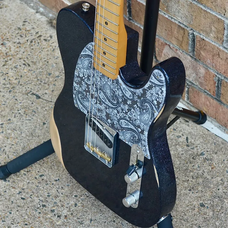 Гитара Brad Paisley Esquire имеет корпус из павловнии и ели с великолепной черной блестящей отделкой Road Worn, кастомную шейку из клена формы «V» с радиусом 9,5” на грифе и кастомные звукосниматели, включая фирменный звукосниматель Brad Paisley Seymour Duncan Secret Agent для шейки, скрытый под черно-серебряной перетаскивающейся пластиной с узором пейсли.