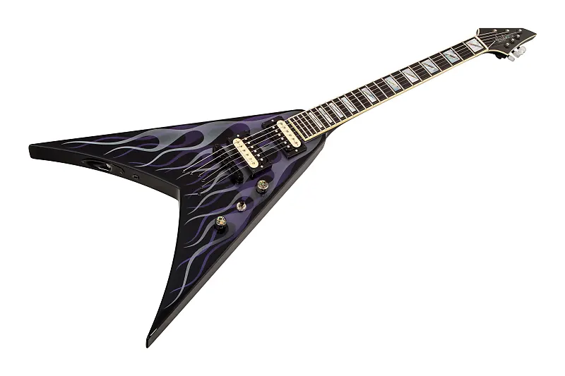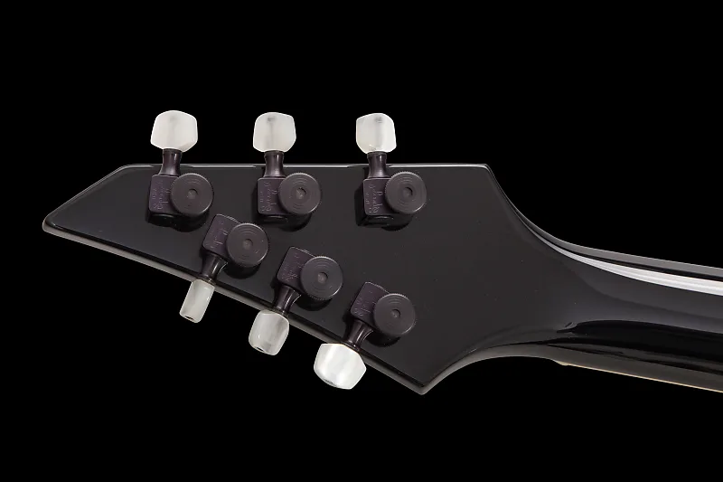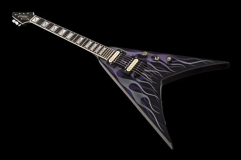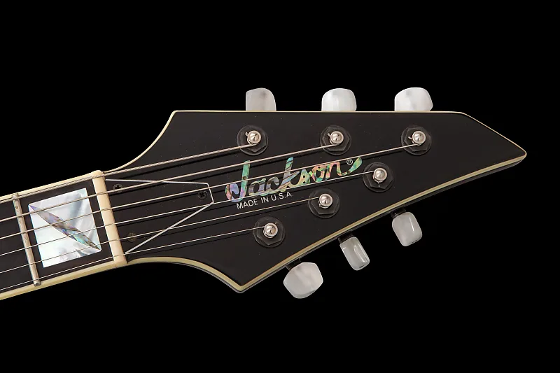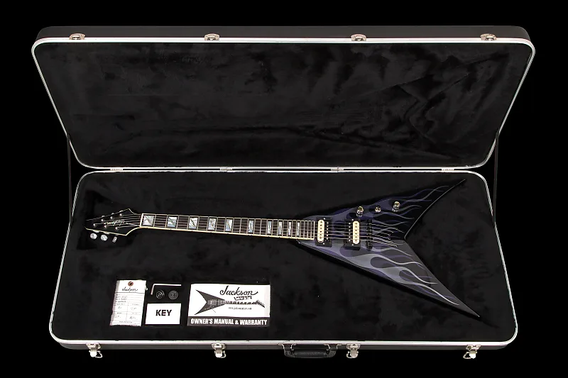 Появившись в 80-х как уменьшенная версия Jackson Double Rhoads (очень редкая модель RR с двумя симметричными длинными рожками), King V быстро стала одной из самых значимых моделей в линейке Jackson. Эта уникальная модель, сделанная вручную в США в 2004 году, выделяется своей эффектной отделкой «Black Ghost Flames», вставками Jackson Shark-Eye и деталями из абалона.