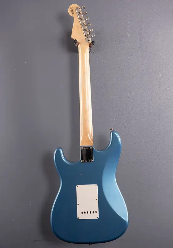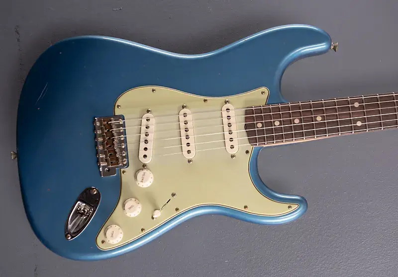 Lake Placid Blue, корпус Alder, гриф из клена середины 60-х с овальной формой C, радиус 9.5″, накладка на гриф из палисандра AAA, лады среднего jumbo размера, мензура 25.5", ширина верхнего порожка 1.650", ручная намотка звукоснимателей Strat 1960 Relic, 5-позиционный переключатель с проводкой Vintage Mod #1, толщина грифа .81" у первого лада и .95" у 12-го, вес 7.7 фунта, в комплекте с жестким кейсом Fender Custom Shop