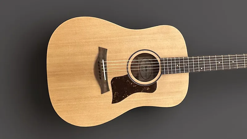 Естественный цвет, корпус Dreadnought Big Baby 15/16, верхняя дека из ели Ситка, пластмассовая розетка с одним кольцом, X-образные распорки, многослойная обратно- и боковая части из ореха, грифовая накладка из черного дерева с итальянскими акриловыми точечными инкрустациями 4 мм на грифе из хард-рок клена, длина мензуры 25,5 дюймов, ширина верхнего порожка 1 11/16 дюйма, в комплекте чехол.