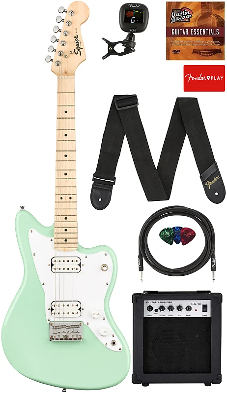 Fender Squier 3/4 размер Mini Jazzmaster HH для детей - комплект Surf Green с усилителем, кабелем, тюнером, ремнем, медиаторами, онлайн-уроками и обучающим DVD от Austin Bazaar