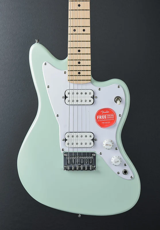 "Squier Mini Jazzmaster HH - идеальный компаньон для игроков, ищущих инструмент уменьшенного размера с классическим стилем и знакомым тембром Fender. Основные моменты включают в себя тонкий и легкий корпус, простой в использовании профиль грифа в форме буквы «C», двойные хамбакеры Squier с 3-полосным переключением для звукового разнообразия и хардтейл-бридж для надежной стабильности настройки».