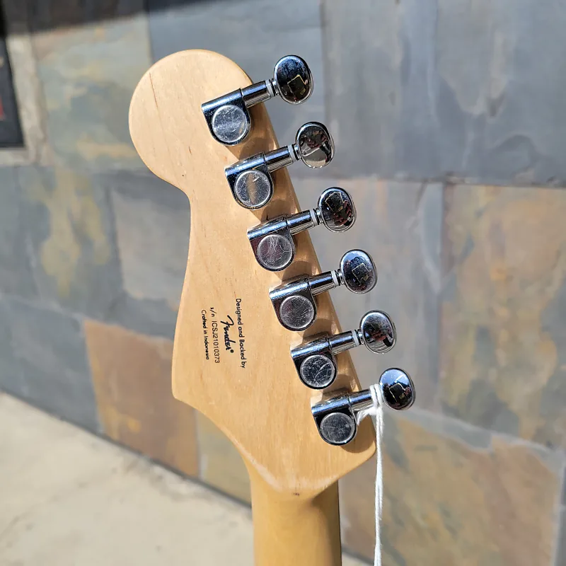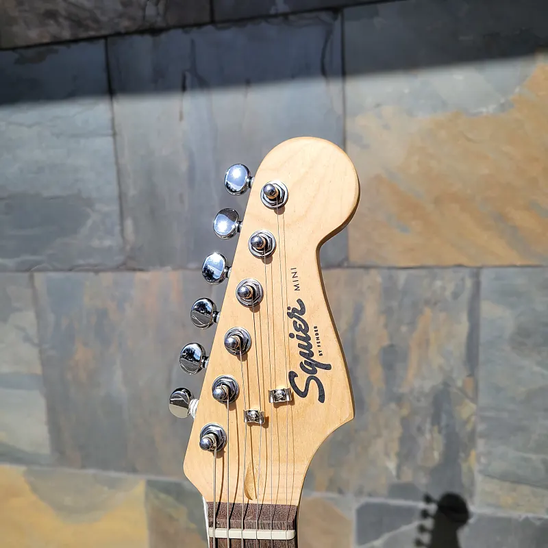 Оснащенная тремя сингловыми хамбакерами Stratocaster и пятипозиционным переключателем для классических тонов Fender, Mini также имеет улучшенные колки, жесткий мост, меньшие крепления для ремня и боковой выходной разъем.
