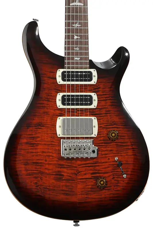 Электрогитара с цельным корпусом, верхняя дека из клена, корпус из махагони, шейка из клена, гриф с накладкой из розового дерева, 3 хамбакера и тремоло PRS - расцветка оранжевый тигровый дымчатый.