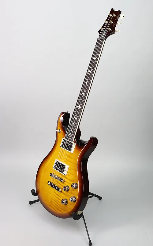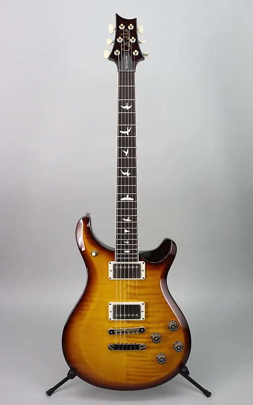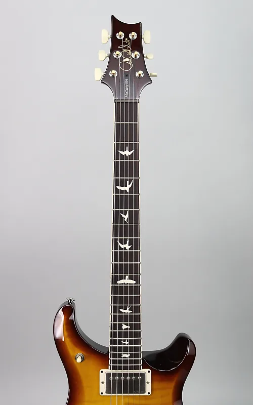 Характеристики: Кленовый топ с ассиметричной скошенной резьбой верха; задняя часть из красного дерева; гриф из красного дерева (узор винтажный); палисандровый гриф на 22 лада; длина мензуры 24,594 дюйма; радиус грифа 10 дюймов; никелевая фурнитура; Двухсекционный мост PRS; инкрустации птицами; Винтажный стиль стройки. Отделка Honey Gold Burst. В комплекте сумка PRS.