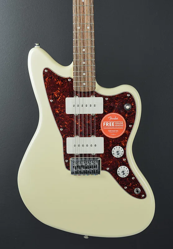 Цвет Olympic White, изготовлено в Китае, глянцевое полиуретановое покрытие, корпус из тополя, гриф из клена с графитовым усилением формы C и радиусом 9,5” с накладкой из индийского лауэра и узкими высокими ладами, длина мензуры 25,5”, ширина порожка 1,6875”, джазмастерские сингл-койл звукосниматели Alnico от Fender.