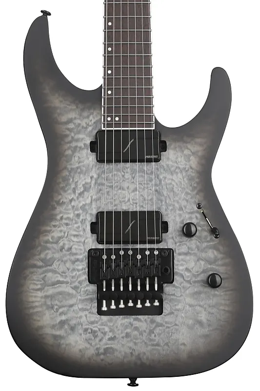 Электрогитара баритонного типа с цельным корпусом из ольхи, верхней декой и грифом из клена, грифовой накладкой из палисандра и двумя хамбакерными звукоснимателями - сатиновый угольный градиент.