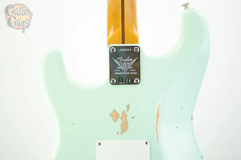 Ее цельный гриф из кленовой четвертинной распиловки выполнен с особым профилем Soft “V” к 70-летию на основе невероятного грифа Strat июля 1954 года, оснащен грифовой накладкой радиусом 9,5” с 21 узким высоким ладом (6105) и костью шириной 1,625”. Три вручную намотанных звукоснимателя Custom Shop Fat ’50s Strat создают четкие высокие частоты и хорошо сбалансированные средние и низкие, используя проводку Fat ’50s Strat и пятипозиционный переключатель.
