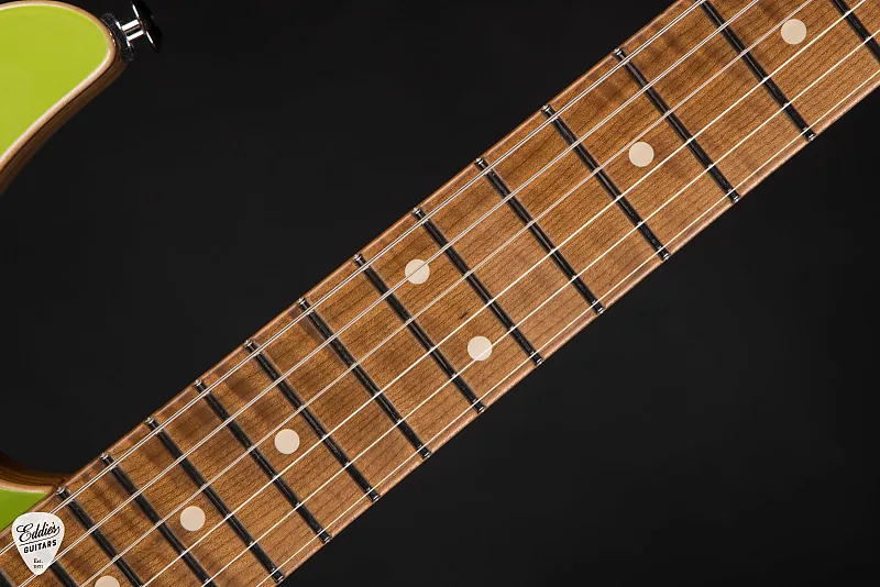 Особое внимание заслуживает гриф из жареного клена с фактурой пламени и гриф, оба имеют красивую структуру и богатый тон, дополнены гладкой, быстрой сатинированной отделкой. Этот гриф оснащен профилем Even C Extra Slim (.770”-.850”) от Suhr, что делает его невероятно быстрым и удобным - идеально подходит как для технических музыкантов, так и для скоростных солистов. Составной радиус 11”-16”, 24 джамбо лада из нержавеющей стали и стандартные закругленные края ладовой доски обеспечивают легкие бенды, быстрые переборы и идеальную интонацию по всей грифовой доске. Зеленые боковые точки Luminlay добавляют классное практическое свечение в темноте, а глинистые маркеры на лицевой стороне сохраняют классический стиль.