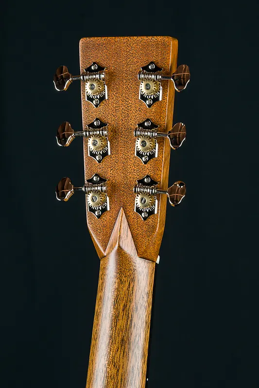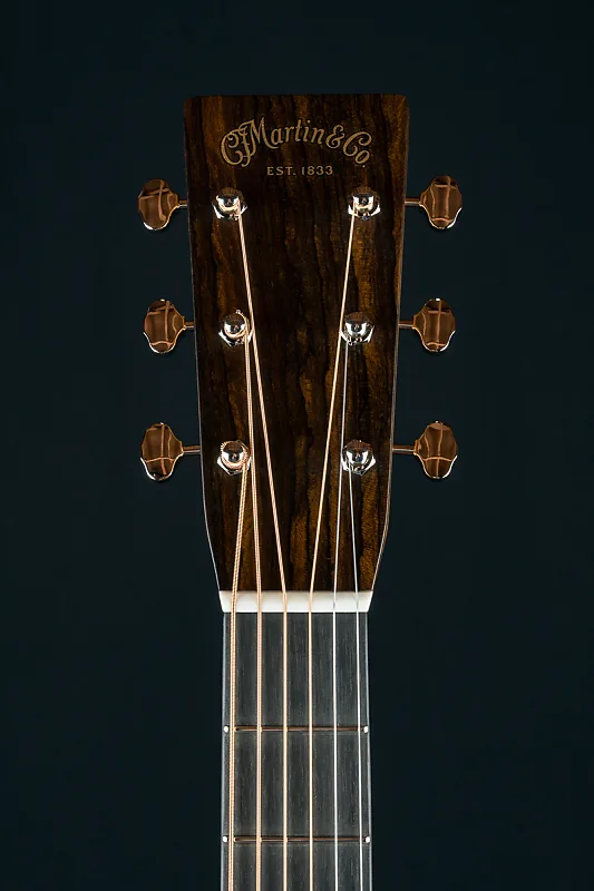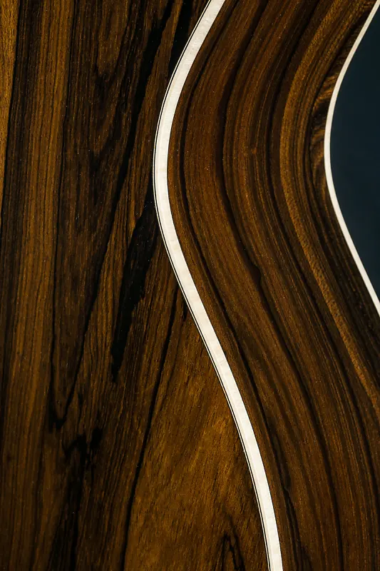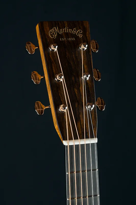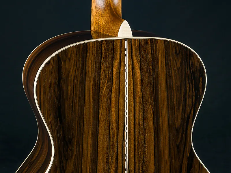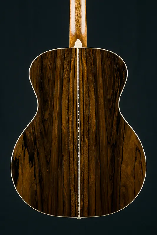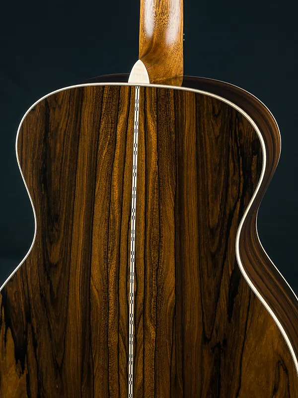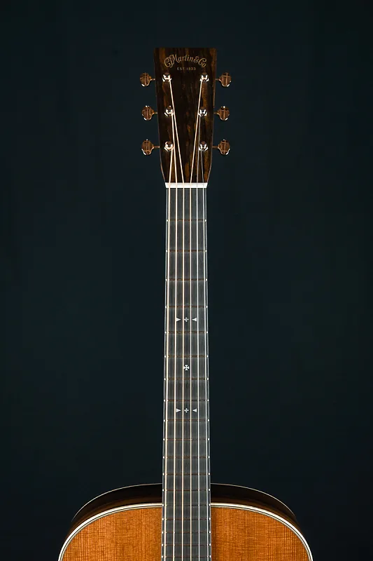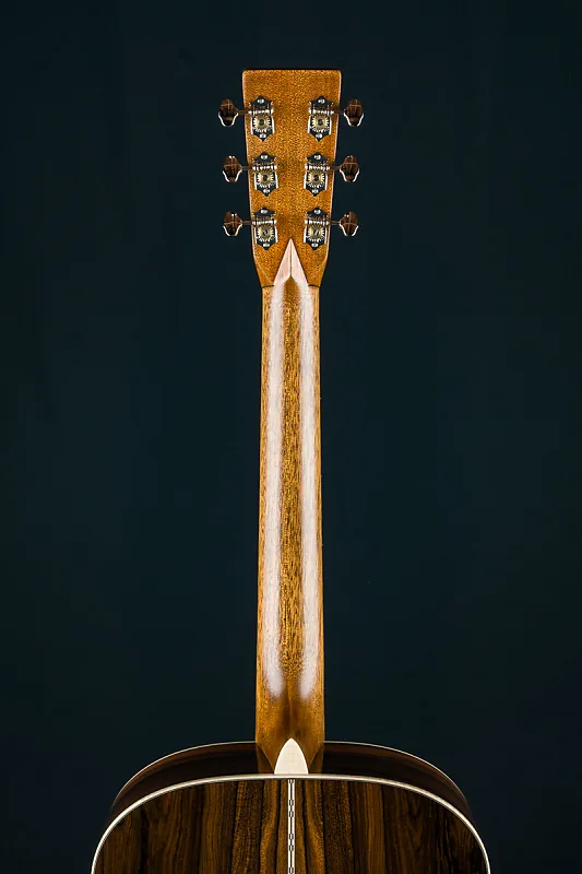 Кастомные особенности включают кант из европейского кленового фламинга, X-образную скобку золотой эры со смещением вперед и скосом, накладку на головку из премиального Зирикоте, инкрустацию грифа в стиле Фоден из перламутра и пауа, каблук и клин из европейского клена с фламингом, а также гриф и мост из черного эбена, стиль-28 контрольной полосы на спине, стиль-28 кленовые/черные окантовки и розетку, модифицированный низко-овальный высокоэффективный конус, колки Grover Nickel butterbean, ширину верхнего порожка 1 3/4″, межседельное расстояние 2 5/32″ и многое другое.