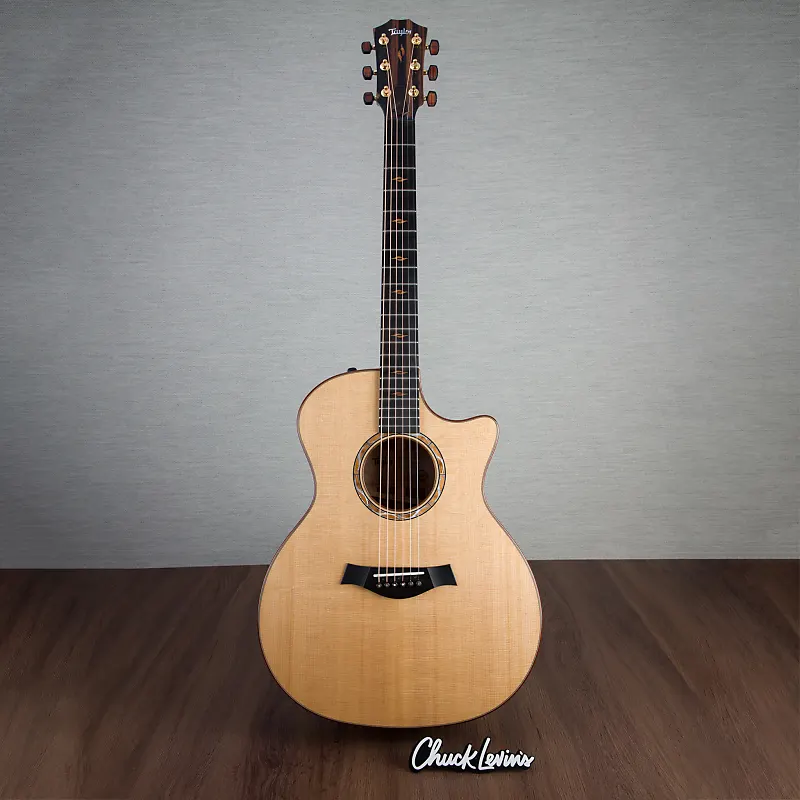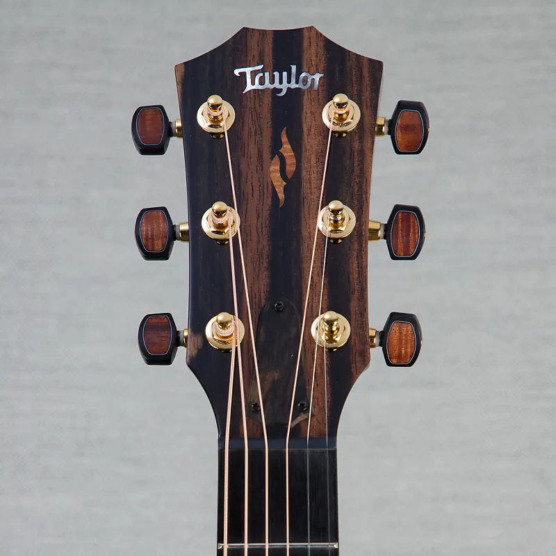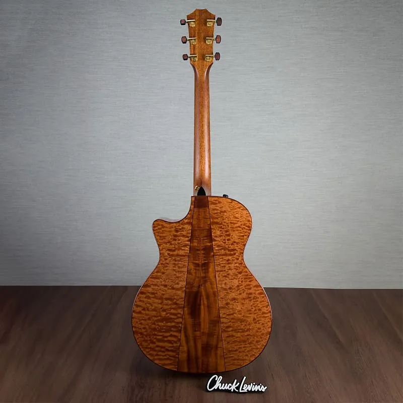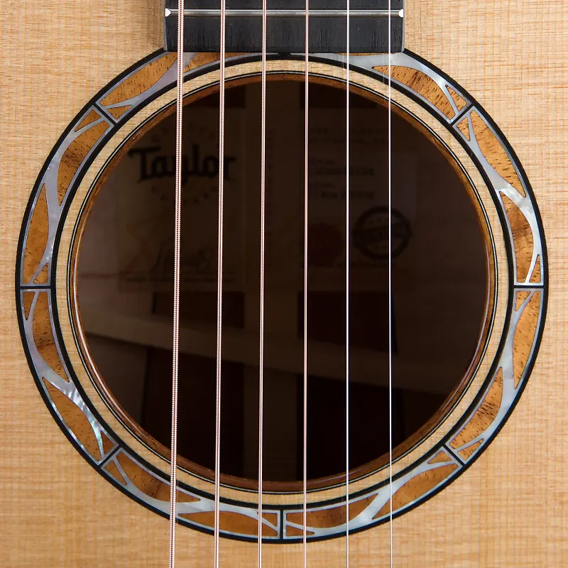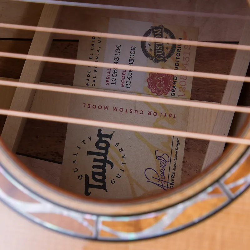 Эта кастомная акустико-электрическая гитара Grand Auditorium выполнена с верхней дека из торафированного елового дерева Sitka и корпусом из кленовой древесины Big Leaf в четырехчастной конфигурации с клином Симонса. Наряду с революционной системой распорок V-Class внутри, эта кастомная модель оснащена вручную уложенной одноцветной розеткой, окантовкой корпуса из фигурного гавайского куа, окантовкой грифа из зебрано West African Crelicam, мостовыми штифтами из окрашенной кости с точками awabhi, инкрустацией Element из гавайского куа на грифе и головке грифа, а также электроникой ES2 с встроенным модулем TaylorSense.