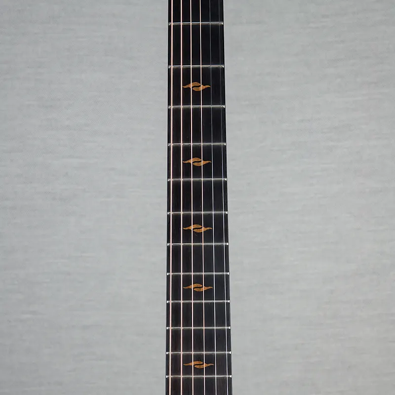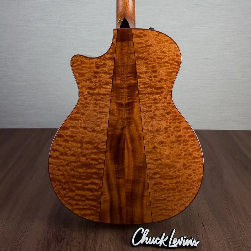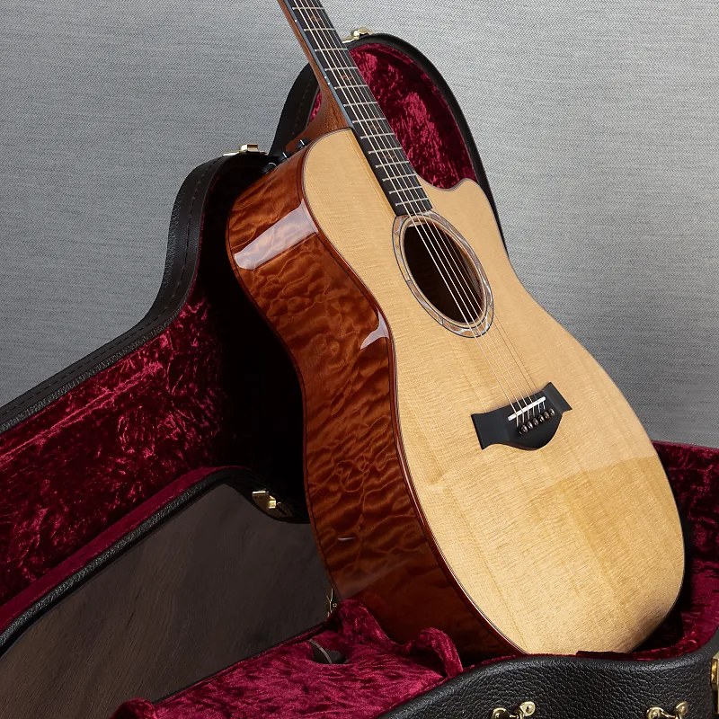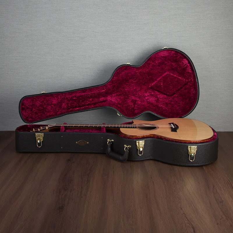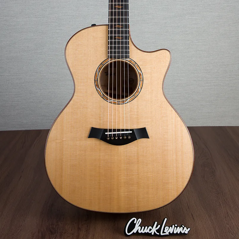 Эта кастомная акустико-электрическая гитара Grand Auditorium выполнена с верхней дека из торафированного елового дерева Sitka и корпусом из кленовой древесины Big Leaf в четырехчастной конфигурации с клином Симонса. Наряду с революционной системой распорок V-Class внутри, эта кастомная модель оснащена вручную уложенной одноцветной розеткой, окантовкой корпуса из фигурного гавайского куа, окантовкой грифа из зебрано West African Crelicam, мостовыми штифтами из окрашенной кости с точками awabhi, инкрустацией Element из гавайского куа на грифе и головке грифа, а также электроникой ES2 с встроенным модулем TaylorSense.