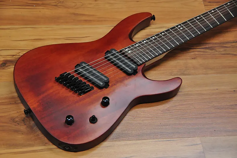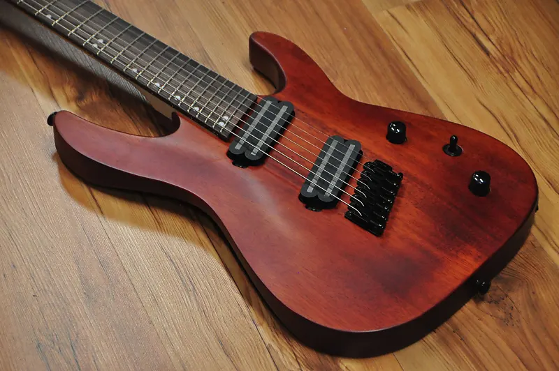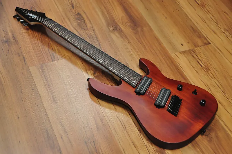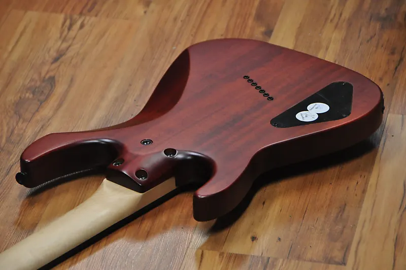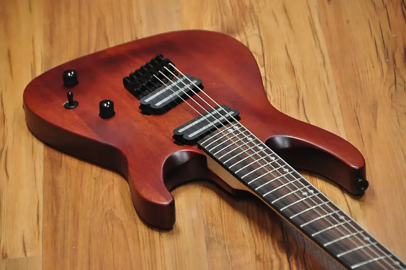 Модель DKAF7 оснащена мультишкальной мензурой 25,5"-27", корпусом из красного дерева с выгнутой декой, цельным крепящимся на болтах грифом из клена с графитовым усилением и соединением scarf, грифовой накладкой с компаунд-радиусом 12"-16" с 24 джамбо ладов и смещенными точками позиций, литейными колками Jackson и головкой грифа 4x3 AT-1.
