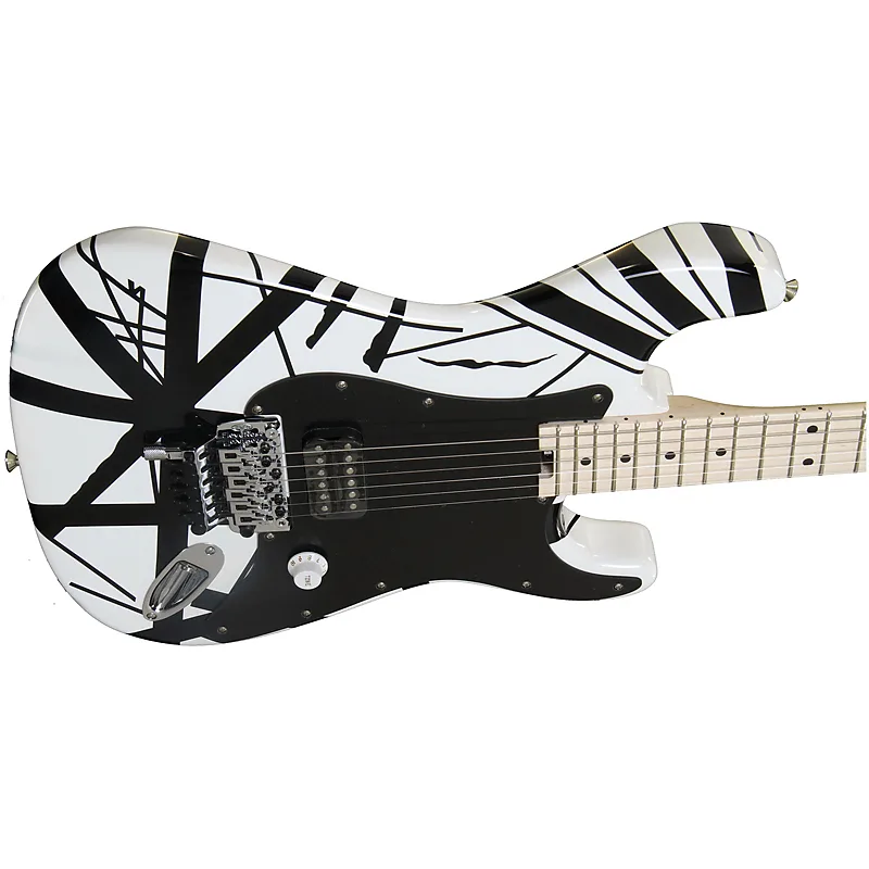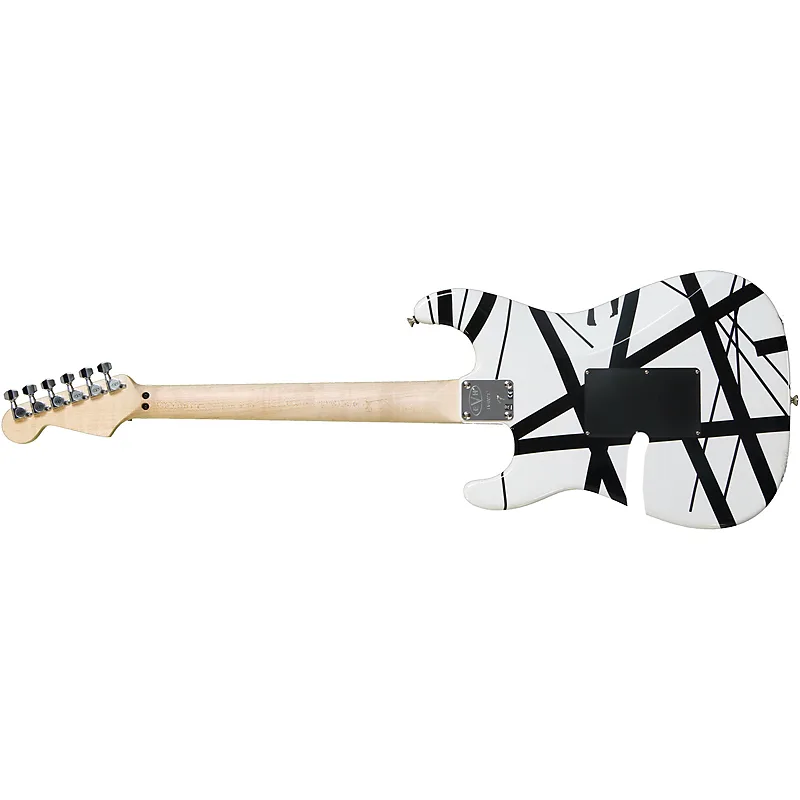 Гитара EVH Striped Series оснащена корпусом в стиле Stratocaster из лиственных пород древесины (basswood) с известной полосатой графикой Эдди Ван Халена, белого цвета с черными полосами.