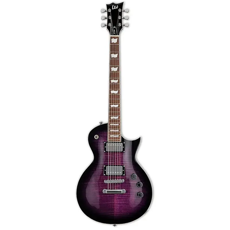 EC-256FM демонстрирует премиальное качество сборки с корпусом из махагони и эффектным верхом из клена Flame в отделке See-Thru Purple Burst. Обвязка корпуса и грифа, а также обвязка головы грифа создают элегантный визуальный эффект, в то время как одноразрезный дизайн Eclipse обеспечивает исключительную сустейн и удобный доступ к верхним ладовым позициям.